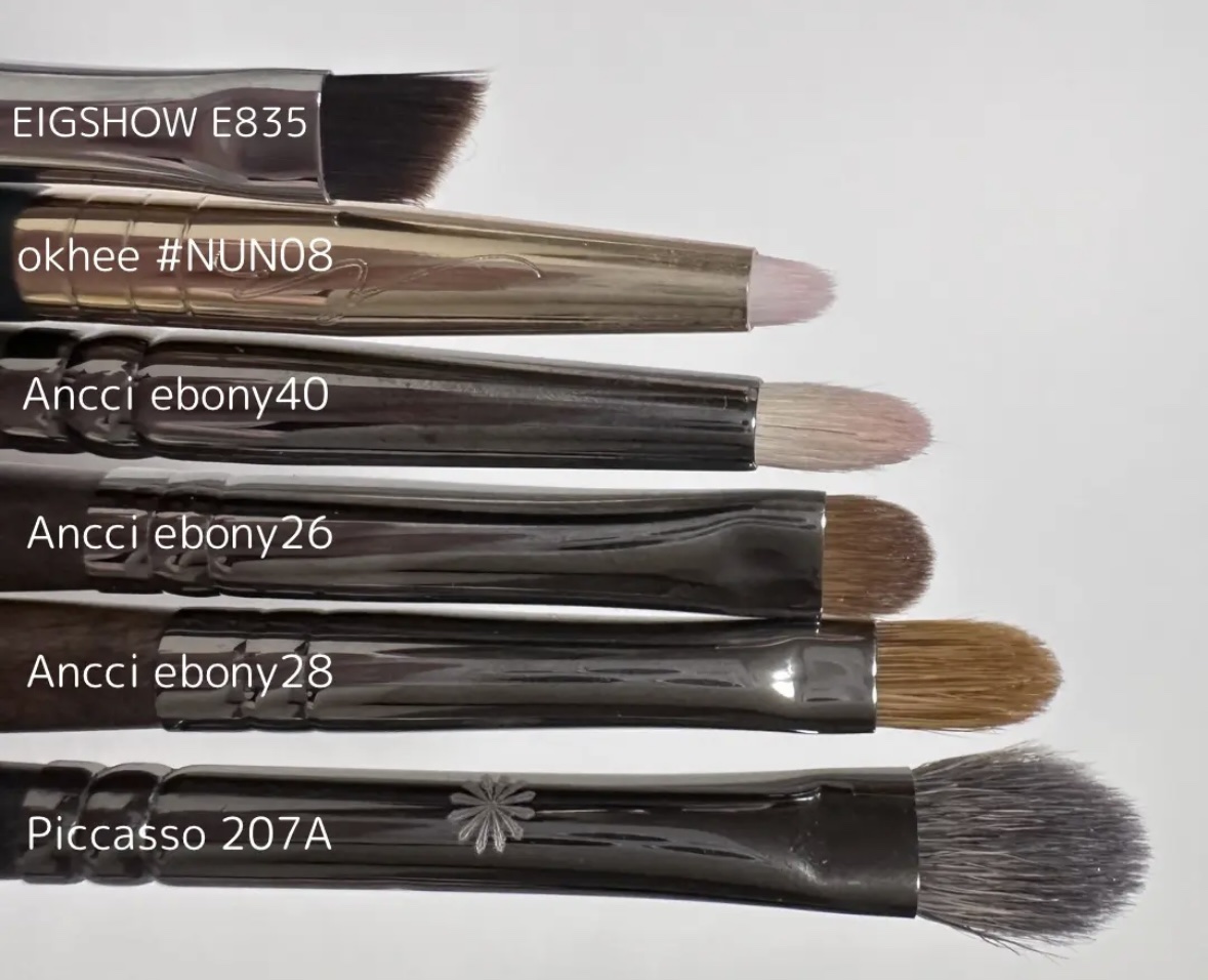 山羊毛ツヤ感のある仕上がり、柔らかい発色 フェイスパウダーやハイライトにおすすめの毛 イタチ毛マット〜ツヤ、リキッドに使える、高発色 ラメをキラキラさせたい時や密着させたい時に◎ リス毛ザ・天使の羽!ふわふわでチクチクしない 灰リス毛は特に柔らかいが値段が高く、繊細 チークやハイライトにおすすめ