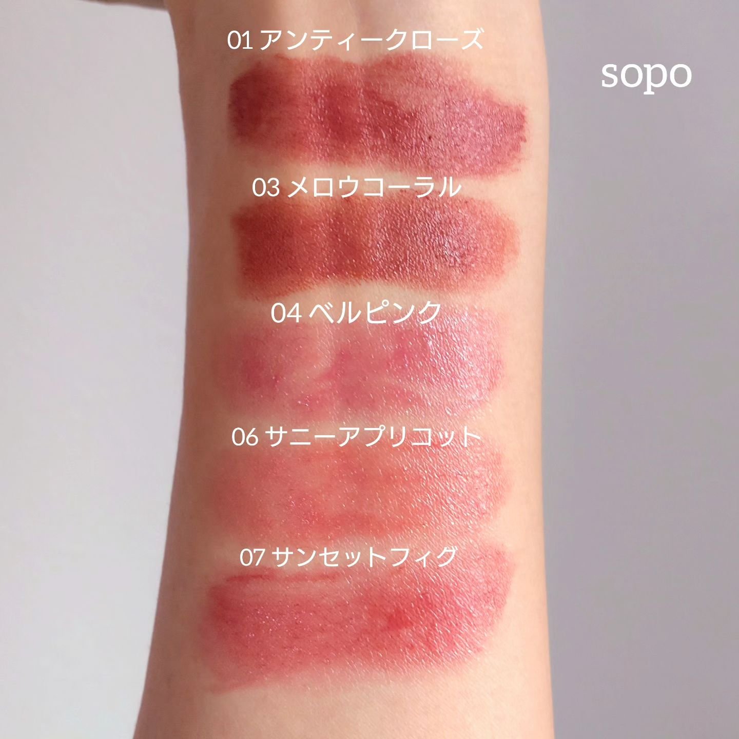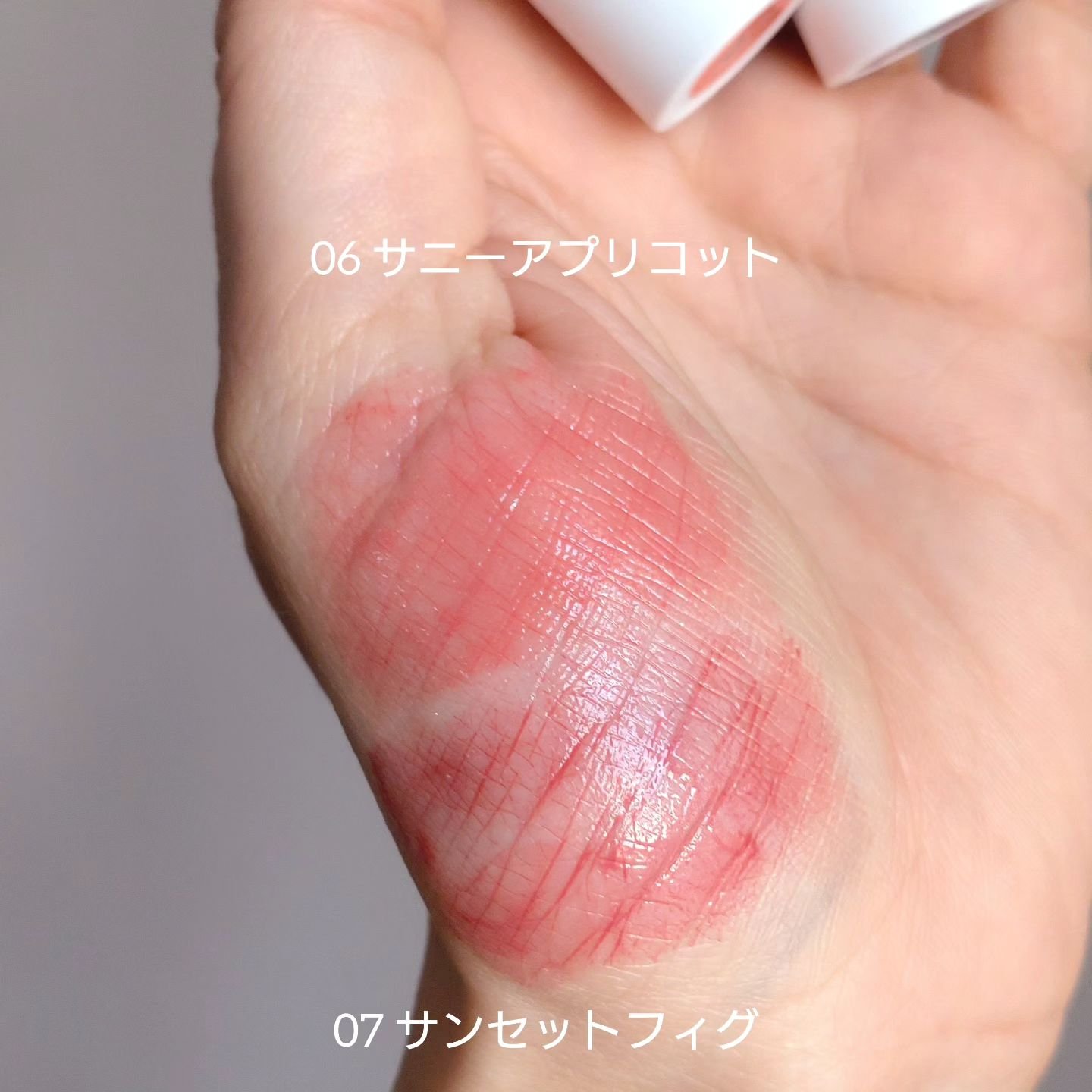 透け発色がつや感、きらめき感があるので透明感もでて可愛い感じのリップで可愛い感じです😊 06 サニーアプリコットは普段使いしやすいコーラルカラーにラメがチラチラして可愛いです😍 07 サンセットフィグは透け感もあるけど血色感レッドで使いやすいレッドでいい感じです😍