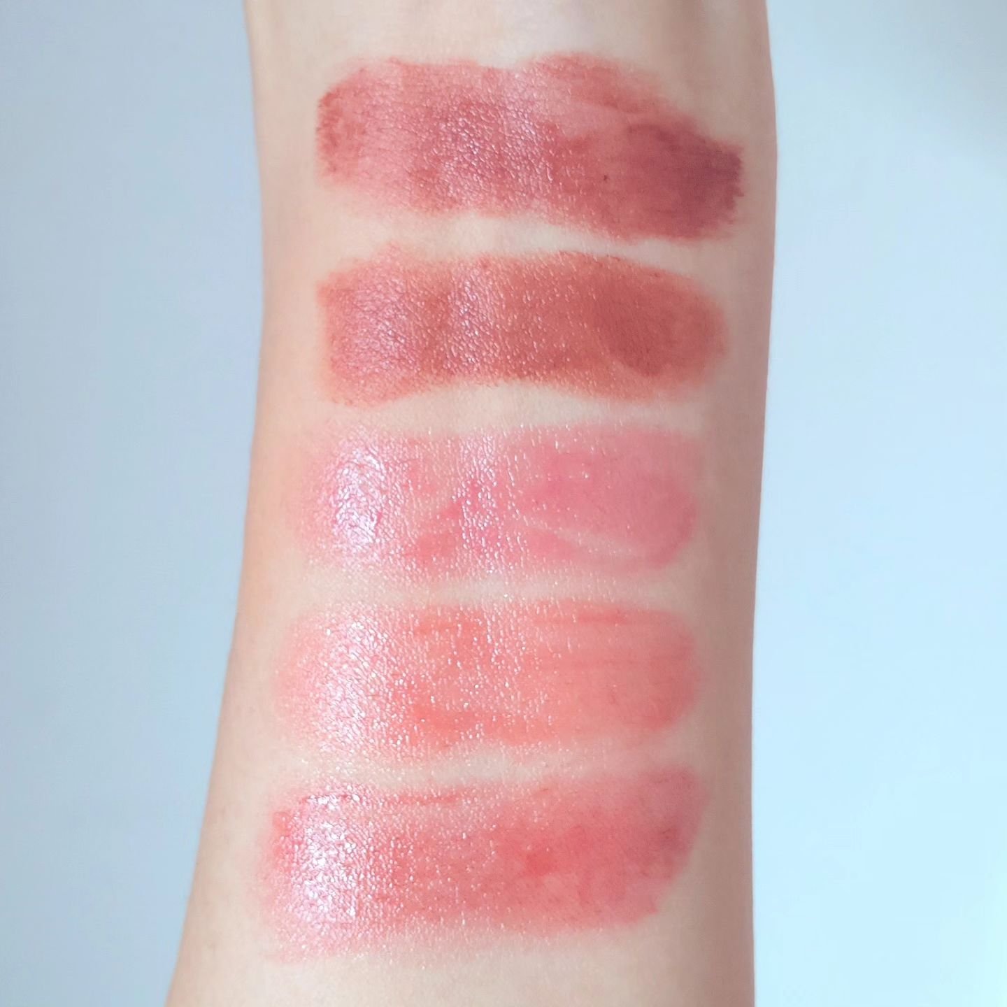 果汁を絞ったような新鮮さとみずみずしさを感じられる発色の良いティントです 透け感があり唇に馴染みやすく色展開も豊富で私はモーブっぽい少し青みのある103ハミングとイエベ向けのブラウンベージュのような108ソルティを選びました つけたては水膜が張ったようなツルンとしたツヤが綺麗で唇の縦じわも少し目立たなくなります💋 上から保湿リップを塗っても色落ちすることなく、また塗って5分ほどでしっかり定着するので使いやすい✨ 103はイエベで唇のみ青みが入った私にはピッタリのMLBBの色味で普段使いに良さそう 108はやや深みのある赤に染まりしっかり目のアイメイクにも合わせやすいやや主張のあるカラーです