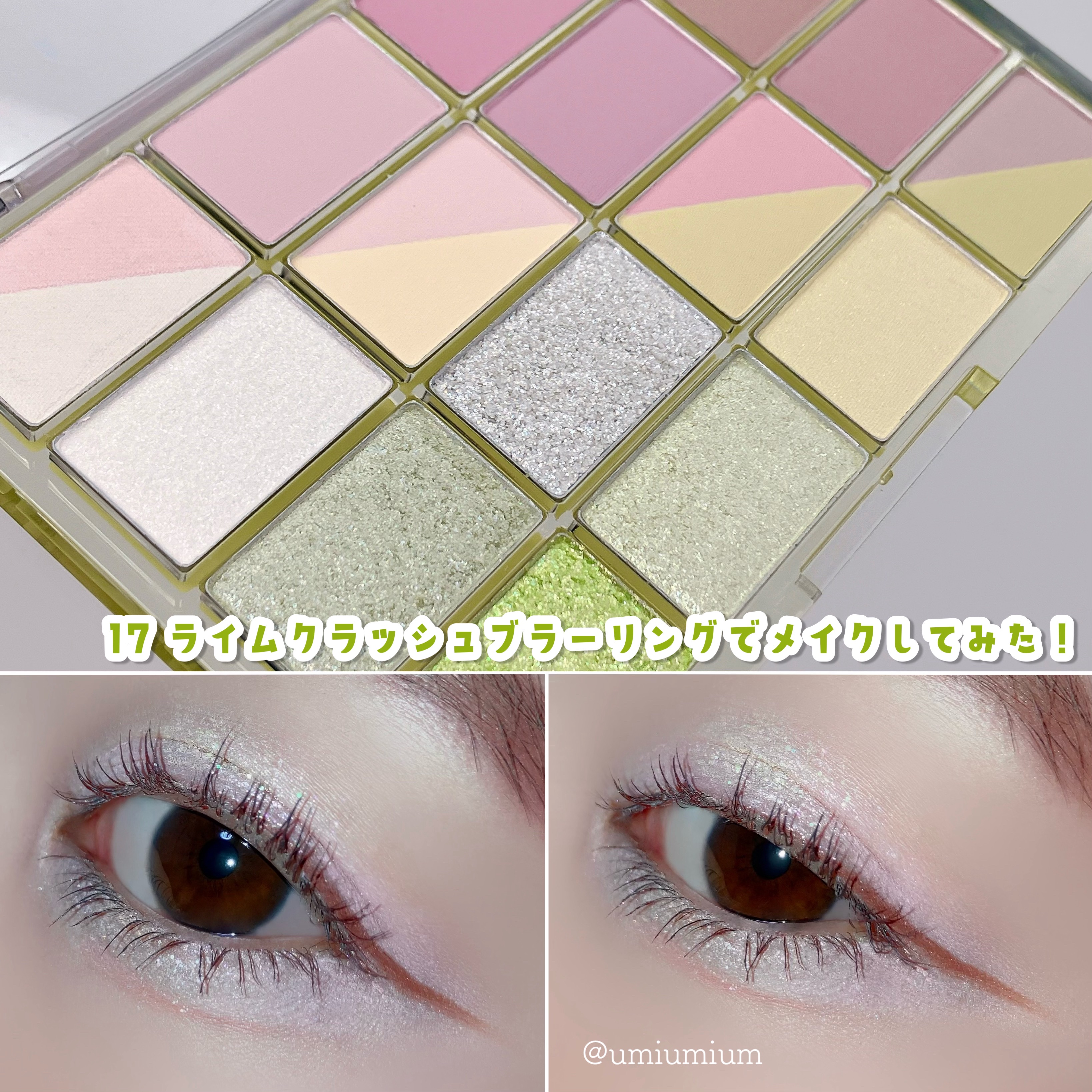 WAKEMAKEといえばアイパレ。 豊富なカラバリで似合うが見つかる。 今回使ったのは17.ライムクラッシュブラーリングなんと20色のパレット。 ピンクとライムがメインのパレットで春夏に使いたいかな。