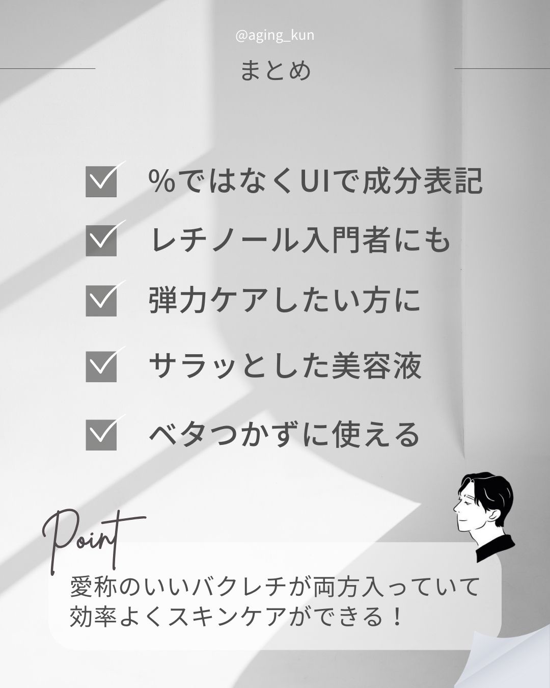 乳白色のサラサラした美容液で、ガラクトミセスとバクチオールが含まれています。 少量でもよく伸びてくれてつけた直後は保湿してしっとりしますが、馴染みがよくベタつかずに、すぐにサラサラとしてくれて使いやすかったです。 肌がふっくら元気になっている気がするので継続して使っていきたいです^^