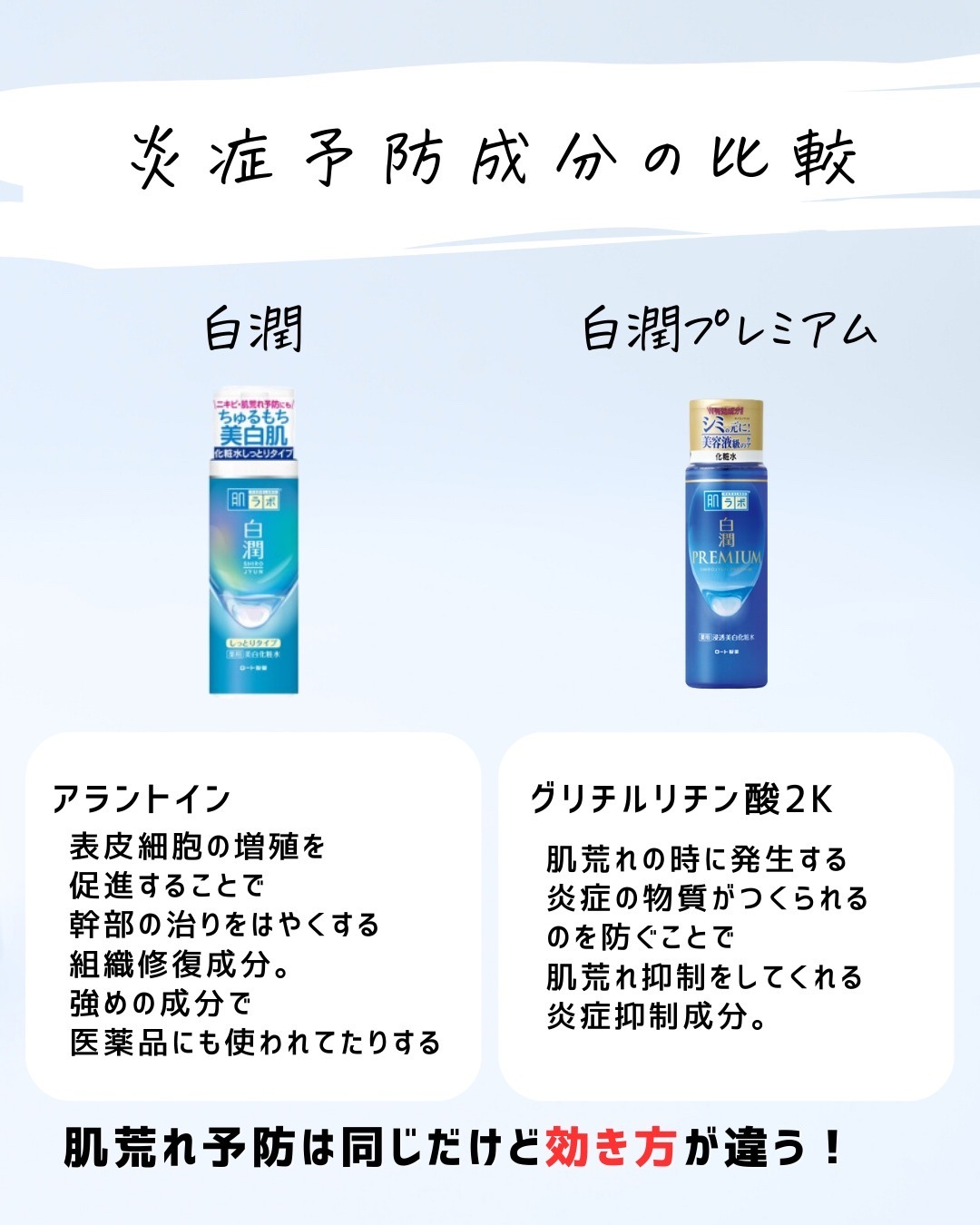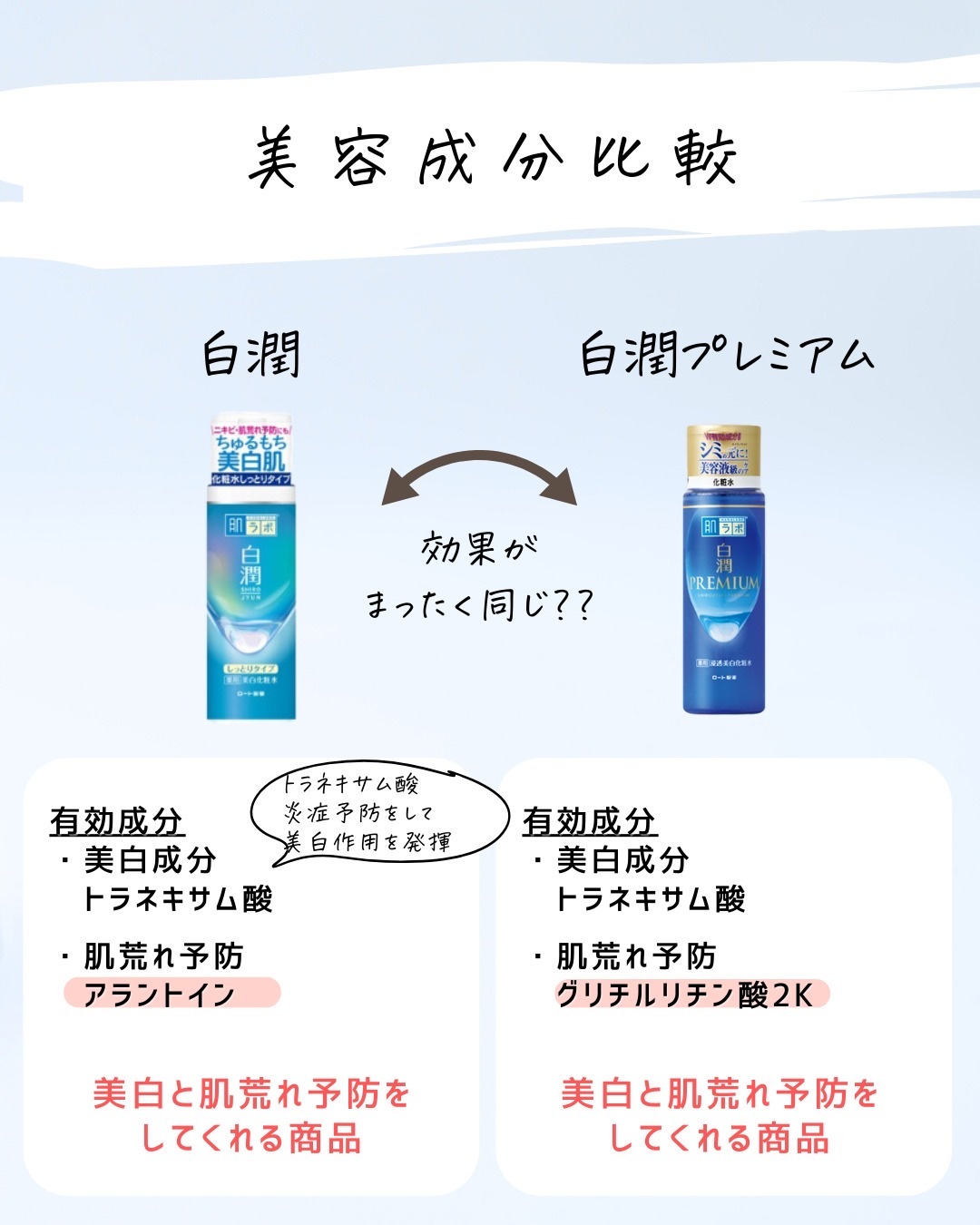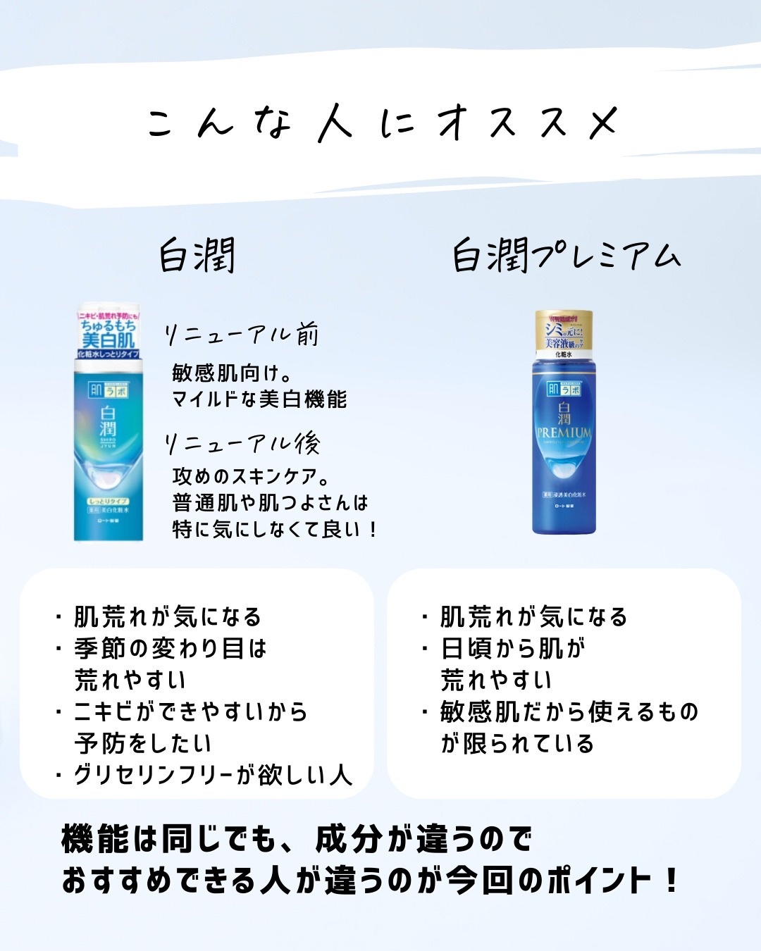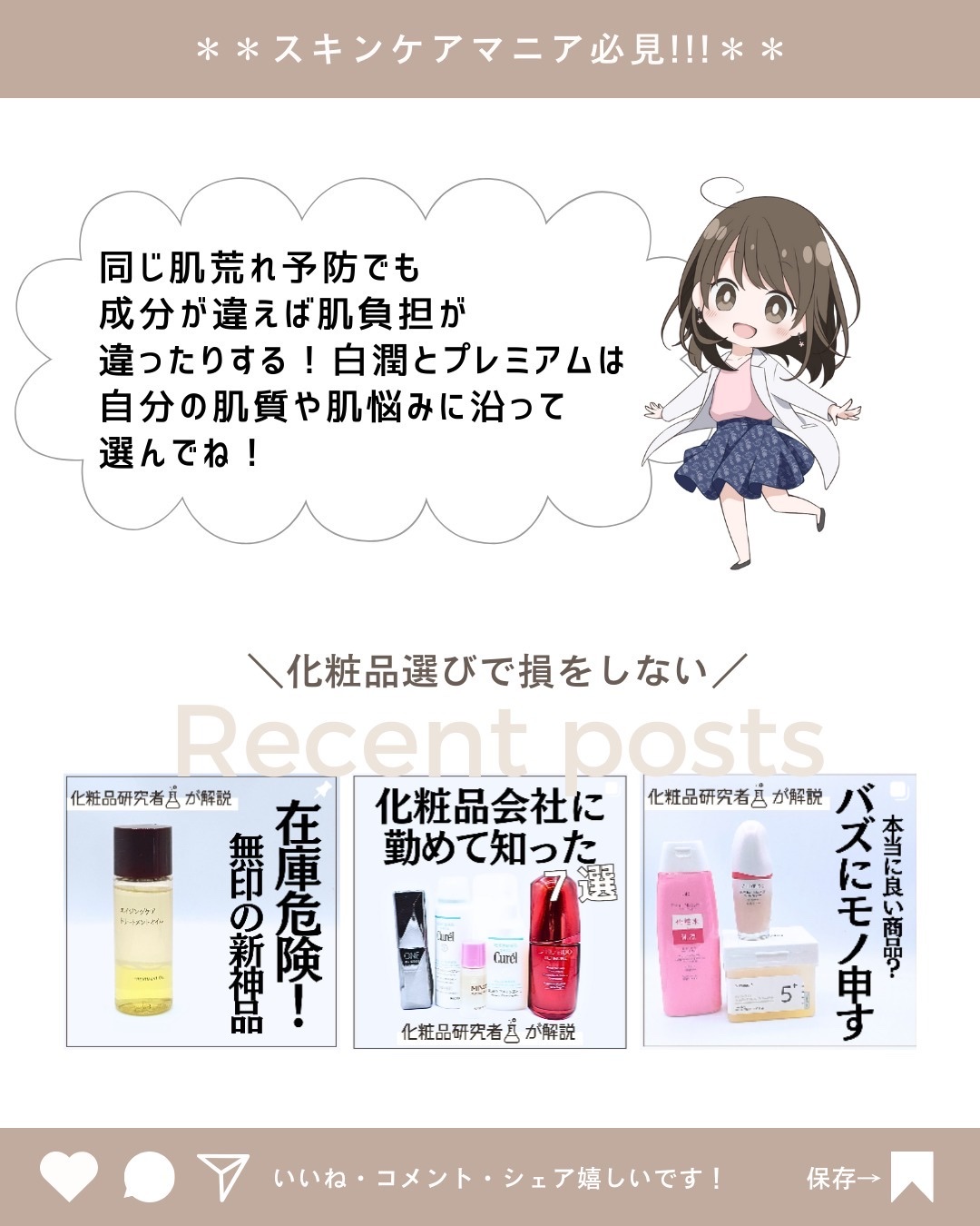 コメント失礼します!白潤シリーズをリピしているものです。 最近リニューアルしたのは知っていたのですが、、 リニューアル前から白潤とプレミアムの差を詳しく分かっていなかったので、凄く参考になりました🥲🙏 次なくなったら、この投稿を見ながら購入します!