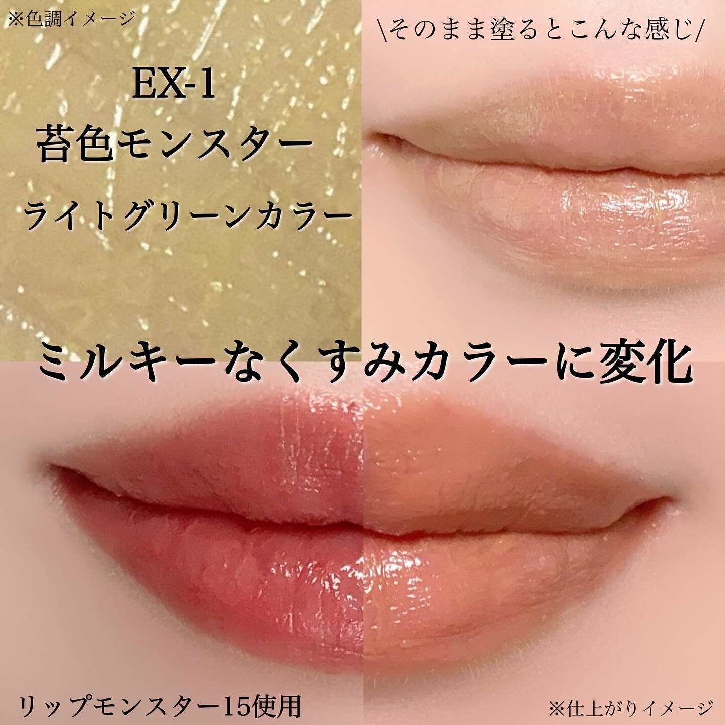 - 【数量限定発売】 口紅の上から重ねて色変化 長時間色持続する闇色モンスター。 当社独自の色持ち技術で、重ねるとモンスター化して落ちにくいリップへ! ■EX-1 苔色モンスター ライトグリーンのリップ上地で、ミルキーなくすみカラーへチェンジ。 ■EX-2 鉄色モンスター ライトグレーのリップ上地で、ダークなスモーキーカラーへチェンジ。 ■EX-3 闇色モンスター クリアブラックのリップ上地で、ダークな深みカラーへチェンジ。