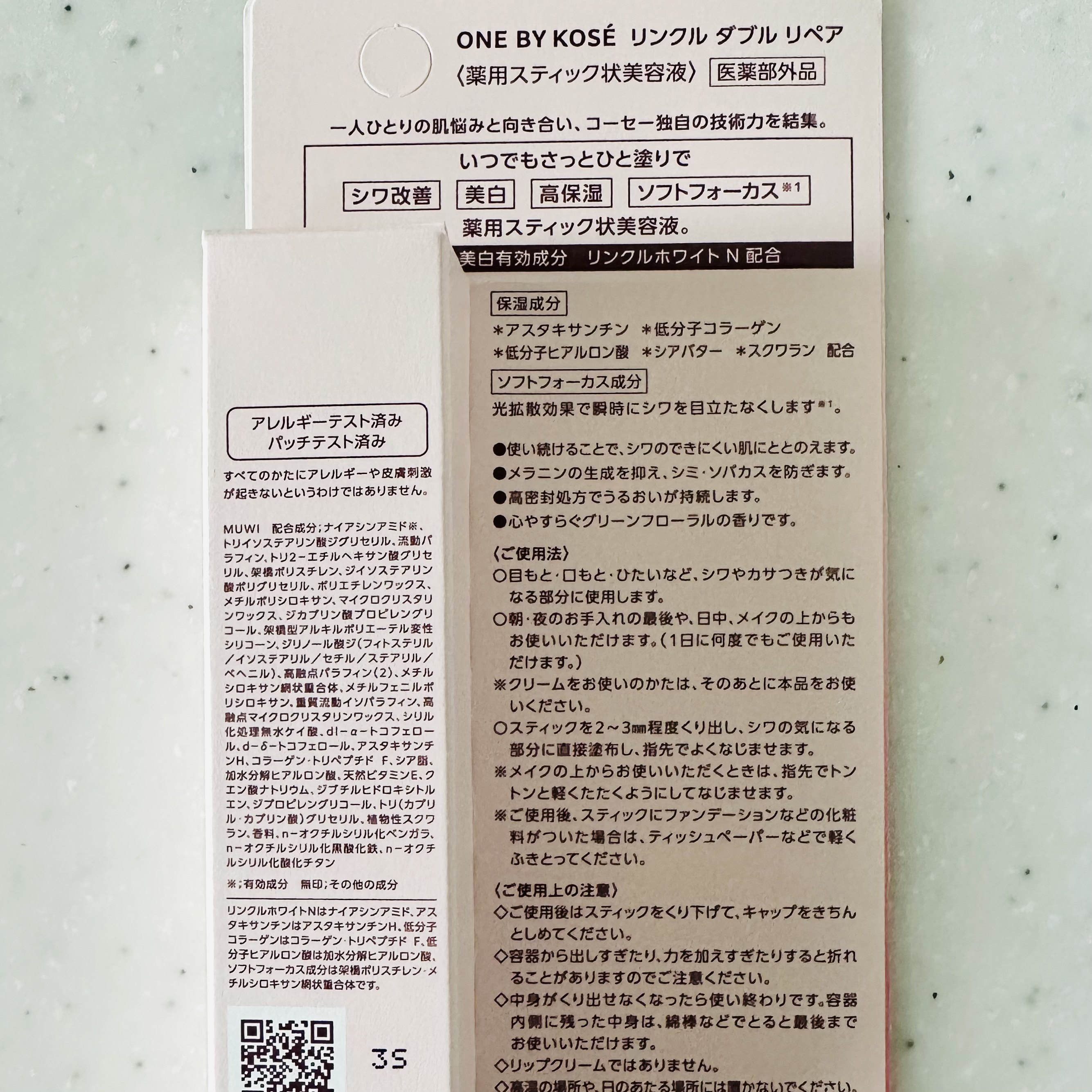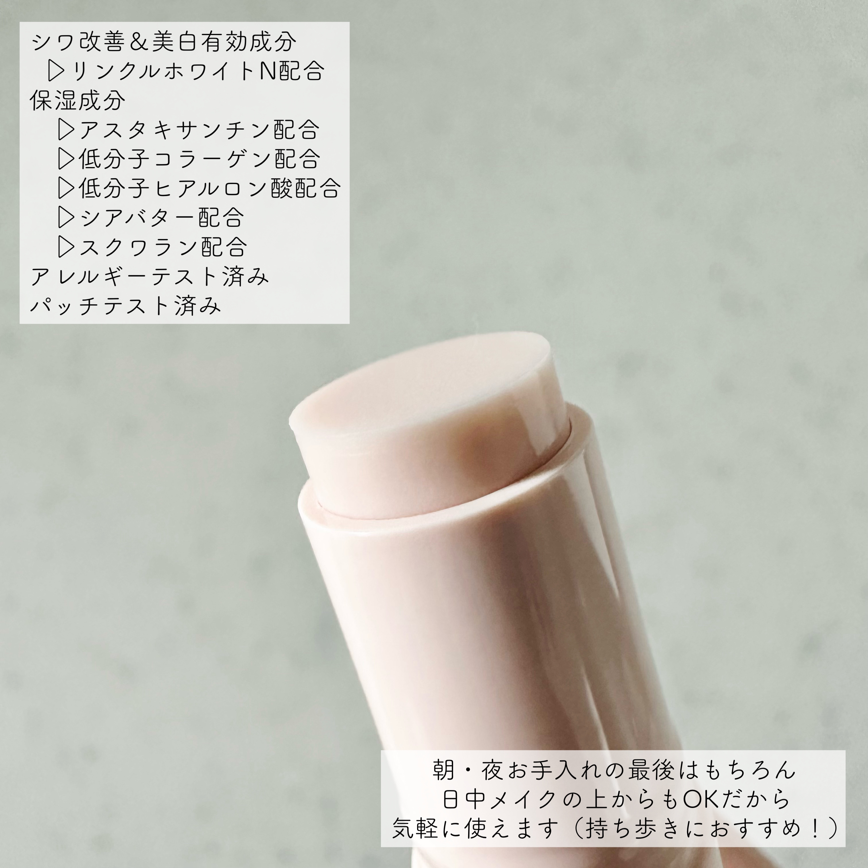 - 【医薬部外品】 24時間いつでもどこでもひと塗り。シワを瞬時にぼかし*1、本格的なシワ改善・美白*2・保湿ケアまで叶える薬用スティック状美容液です。 日中、シワが気になったら、ササッとシワぼかし ●ソフトフォーカス成分が光を拡散。凹んで暗く見えがちなシワを、瞬時に目立ちにくくします。また、肌に溶け込むピンクベージュ色のベースが、シワを明るくぼかします。 シワ改善&美白有効成分「リンクルホワイトN*3」配合 ●真皮と表皮の2 層にはたらきかけ、シワを改善。さらに、メラニンの生成を抑え、シミ・ソバカスを防ぎます。 ●高密封処方を採用し、うるおいが持続シールド感の高いワックス状・ペースト状のオイルを配合。肌と一体化するようになじみ、日中もうるおいを密封します。 メイクの上からも使いやすい、心地よい感触 ●オイルベースにリンクルホワイトN を配合した、コーセー独自処方。メイクの上から使ってもファンデーションがヨレにくいのびの軽さと、適度な密着感を実現。あと肌のベタつきやズルつきもないので、もちろん、メイク前にもご使用いただけます。 ●やすらぐグリーンフローラルの香り ●アレルギーテスト済み*4 ●パッチテスト済み*4 *1 粉体のメイクアップ効果 *2 メラニンの生成を抑え、シミ・ソバカスを防ぐこと *3 ナイアシンアミド、アスタキサンチンはアスタキサンチンH、低分子コラーゲンはコラーゲン・トリペプチド F、低分子ヒアルロン酸は加水分解ヒアルロン酸、ソフトフォーカス成分は架橋ポリスチレン・メチルシロキサン網状重合体です。 *4 すべてのかたにアレルギーや皮膚刺激が起きないというわけではありません。