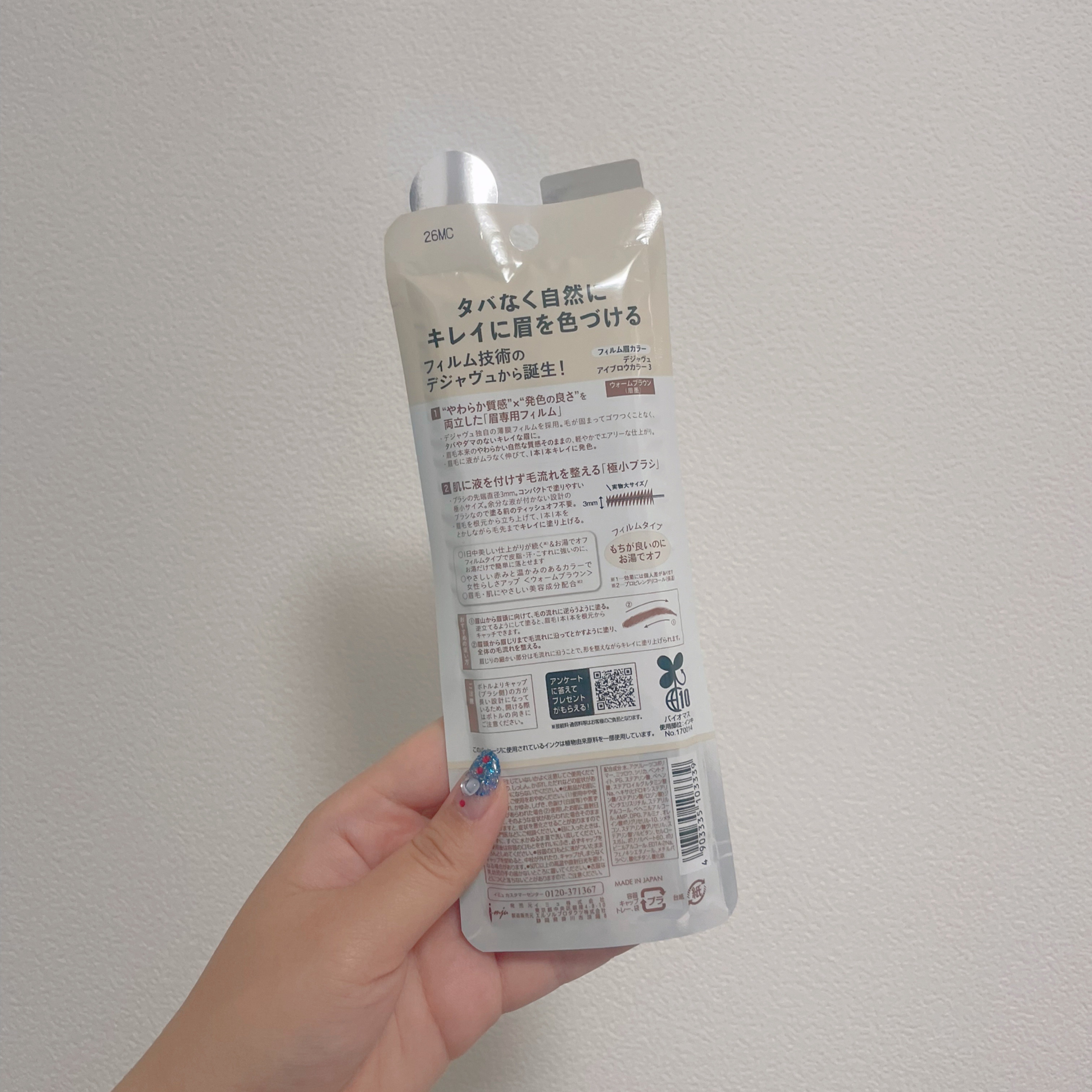 - \\25年3月定番新色モカグレージュ発売// 「フィルム眉カラー」なら眉の印象を自然にやわらげ、ふんわり質感の垢抜け眉に! 1.塗りやすい極小ブラシ ・ 先端直径3mmで、地肌に液がつきにくく根元から色づける ・余分な液がつかない設計で、ティッシュオフ不要 2.眉専用フィルム液 ・眉毛1本1本にキレイに色付き、自眉の黒さをやわらげる ・タバになったり、パリッと固まったりせず、まるで自眉のような仕上がり ・皮脂・汗・こすれに強いのにお湯で簡単オフ (※2025年9月以降、商品パッケージをリニューアル。)