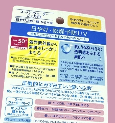 みずみずしいジェルなので、とてものばし広げやすいです。軽いつけ心地でべたっと感は感じませんでした。 強烈紫外線から素肌をしっかりまもり、主にシミの原因となるUV-Bも、ハリ・弾力低下の原因となるUV-Aもしっかり防ぐ!! 専用クレンジング不要でせっけんで落とせるって、らくちんで便利です。化粧下地にも使えるので、毎日使いにもいいですよね〜