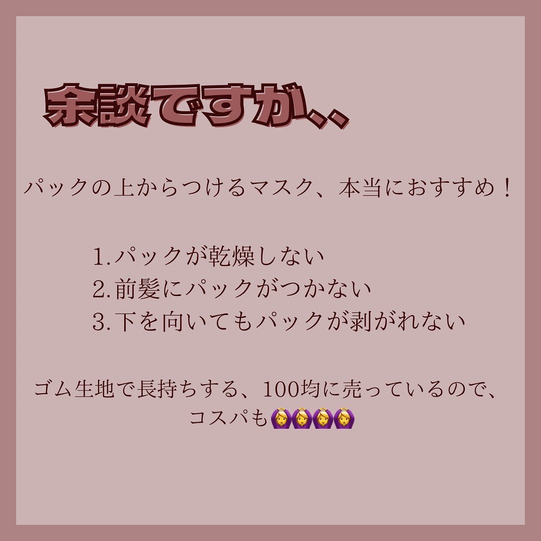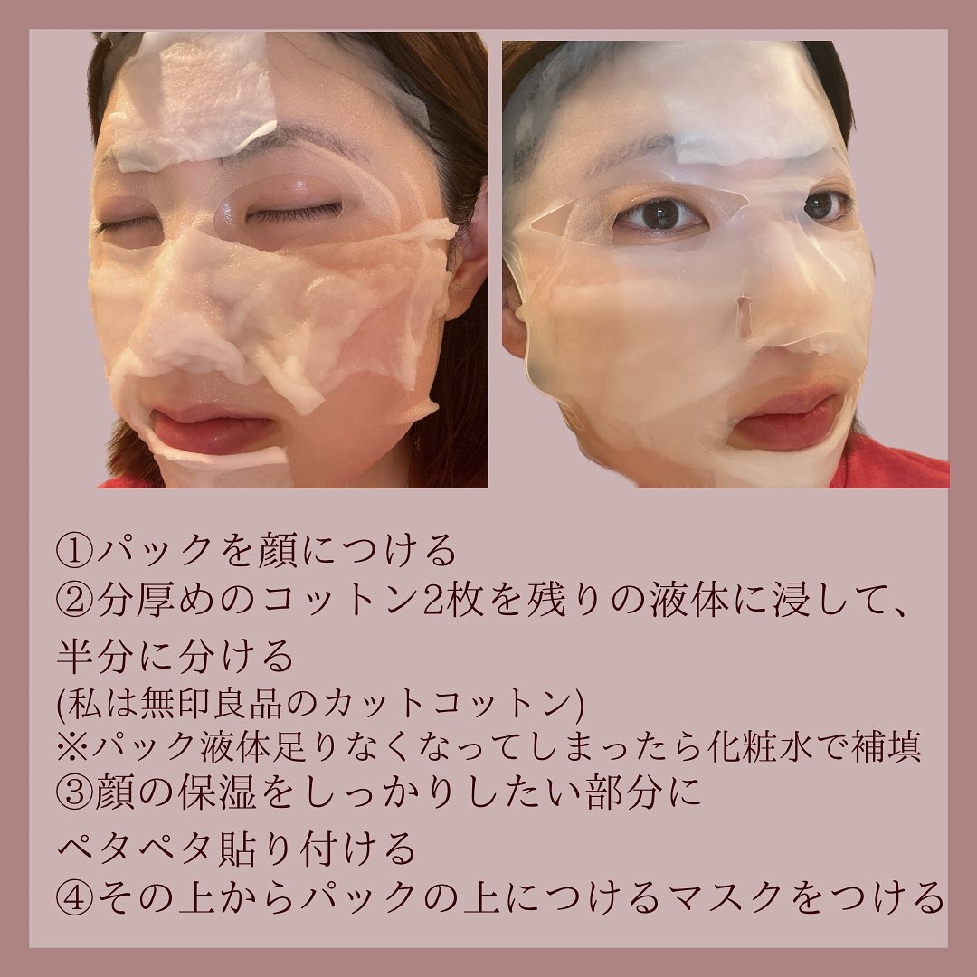 パックにたっぷりつけても液だれしちゃうのももったいない😭 液体全部を使いたくなってしまいます! 以前エステの担当の方からコットンにパックの残りの液体をつけて、小鼻辺りにつけるといいよと教えていただいたので、それ以降そうしてる!! 複数枚入ったパックの場合は小鼻をやっても液体があまるので、目の下とか口周りにも付けて、贅沢保湿💓💓💓