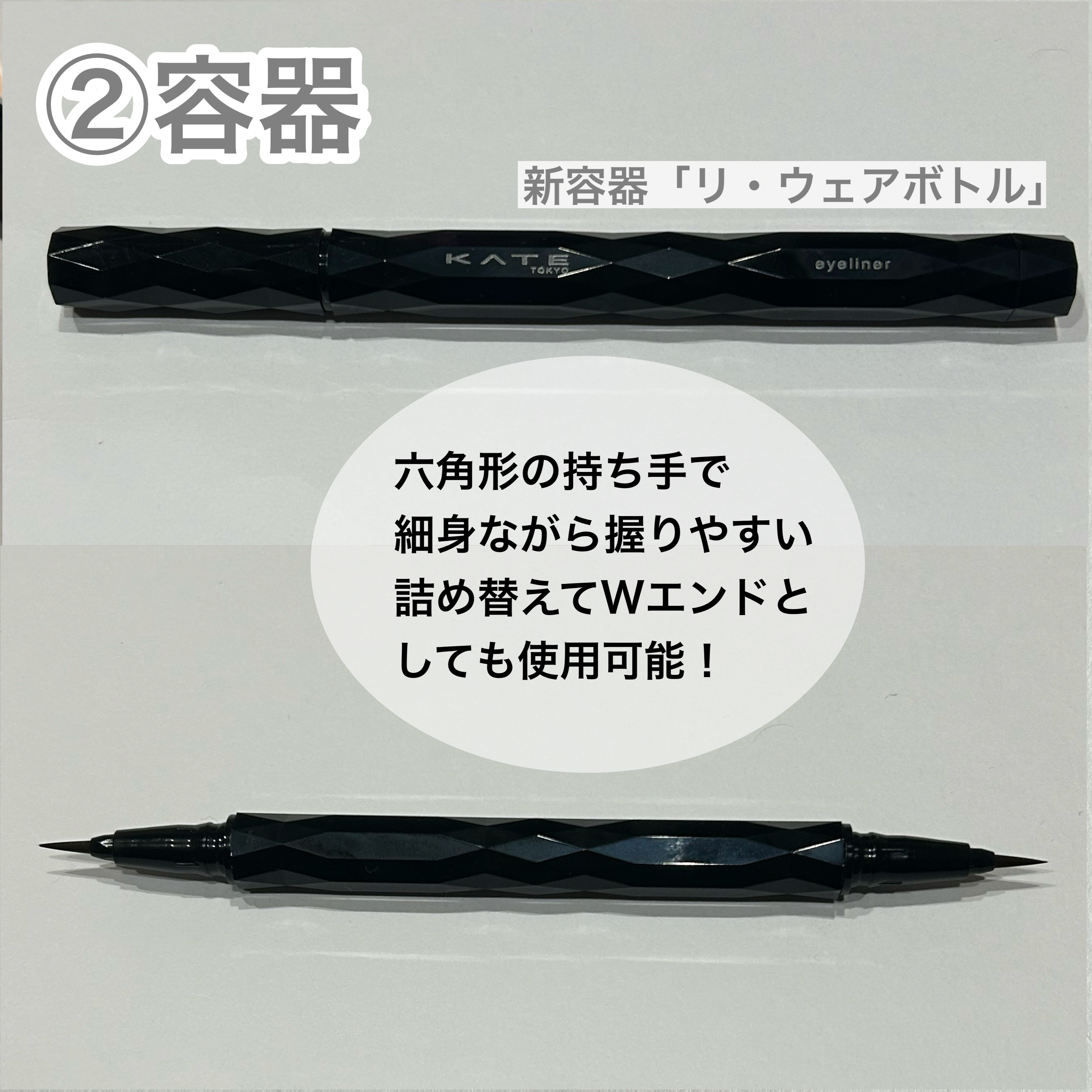 - 強い筆圧でも、どこを持っても極細ラインがブレずに描け、色が長時間持続するリキッドライナー。 ●極細ラインを安定して描けるケイト独自開発筆。 ●どこを持っても指先がフィットするダイヤモンドカット形状の容器。 ●汗・水に強く、号泣しても落ちにくいウォータープルーフタイプ。 ●皮脂・こすれに強い、スマッジプルーフタイプ。 ●ケイト スーパーシャープライナーEX4.0(レフィル)をセット可能です。 ●改良ポイント 極細ラインが安定して描き続けられる独自開発の筆 落ちにくさアップ 付け替えできる新容器「リ・ウェアボトル」 専用レフィルを付け替えて何度も繰り返し使える! 好きな色を組み合わせられるWエンド使用も! ※ケイト スーパーシャープライナーEX3.0と比較して <ショート筆 レフィル> 超極細ラインがちょこちょこ描けて失敗しにくい 毛先が短いショート筆タイプのリキッドライナーレフィル。号泣しても落ちにくく、皮脂・こすれに強い。 ●お湯オフタイプ ●一日中色持続 ●ケイト スーパーシャープライナーEX4.0のホルダー本体部、またはスーパーシャープライナー用ホルダーにセットして使う付け替えタイプです。筆先ごと付け替えられます。 ●全5色 BK-1(漆黒ブラック) BR-1(自然なブラウン) BR-2(ビターブラウン) BR-6(ダークブラウン) GY-1(ダークグレージュ)