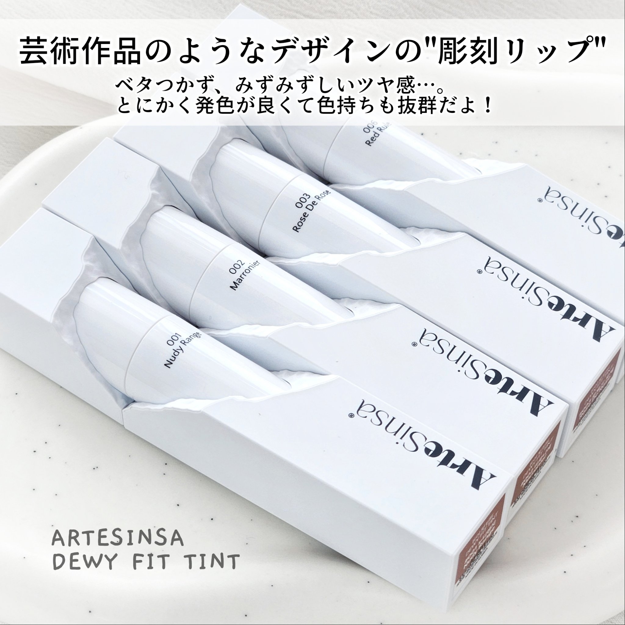 - 【Dewy Fit Tint 】は「彫刻ティント」で話題となったArteSinsanのシグネチャーティント 001/005カラーはリニューアルカラーで登場! 水分たっぷりのしっとりしたテクスチャーにウォータリーコーティングで鮮やかな発色に立体感を与えてくれます。 長持ちする着色力と高い保湿力を兼ね備え、唇に優しい使い心地で使用でき密着力も◎! まるでアーティスティック彫刻のようなティントです。