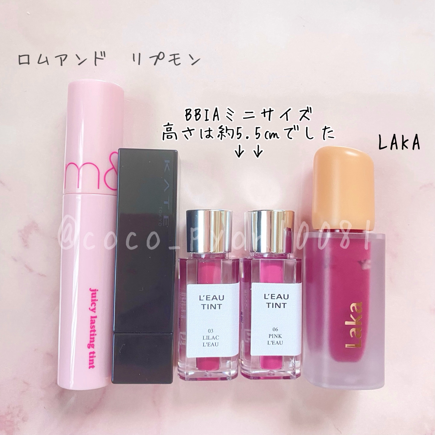 - - うるおいリップなのにしっかりカラーが定着し、時間が経っても塗りたてそのままのカラーを維持 *色が落ちにくいことから「飲み会リップ」としてSNSで話題に - 水のように軽くて快適なグロウティント、塗り重ねるほど鮮やかで透明に浮き上がる水彩画カラー - 香水瓶をイメージしたBBIA初のカスタムデザイン。パッケージはもちろん、カラーとテクスチャーに真心を込めて開発