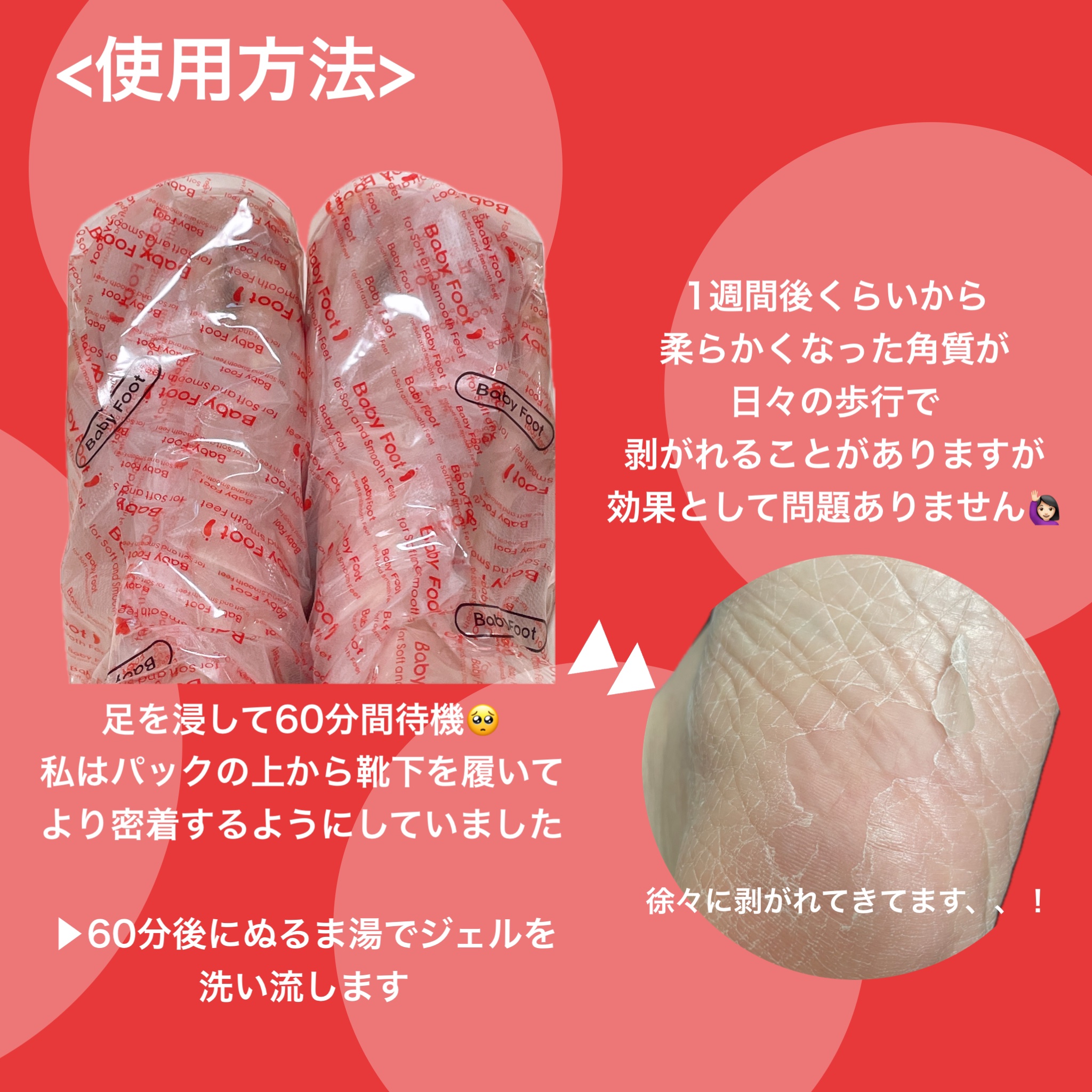 乾燥でカサカサになった足の角質のケアにおすすめのフットパックをご紹介! こちらをお試しするのは2度目ですが、前回角質が綺麗に剥けつるつるになったので今回も楽しみにしていました♡ 使用後3日ほど経つと、お風呂上がりに角質が浮いてくるようになり、少しずつ古い角質が剥がれていきます、もちろん痛みはなし!!