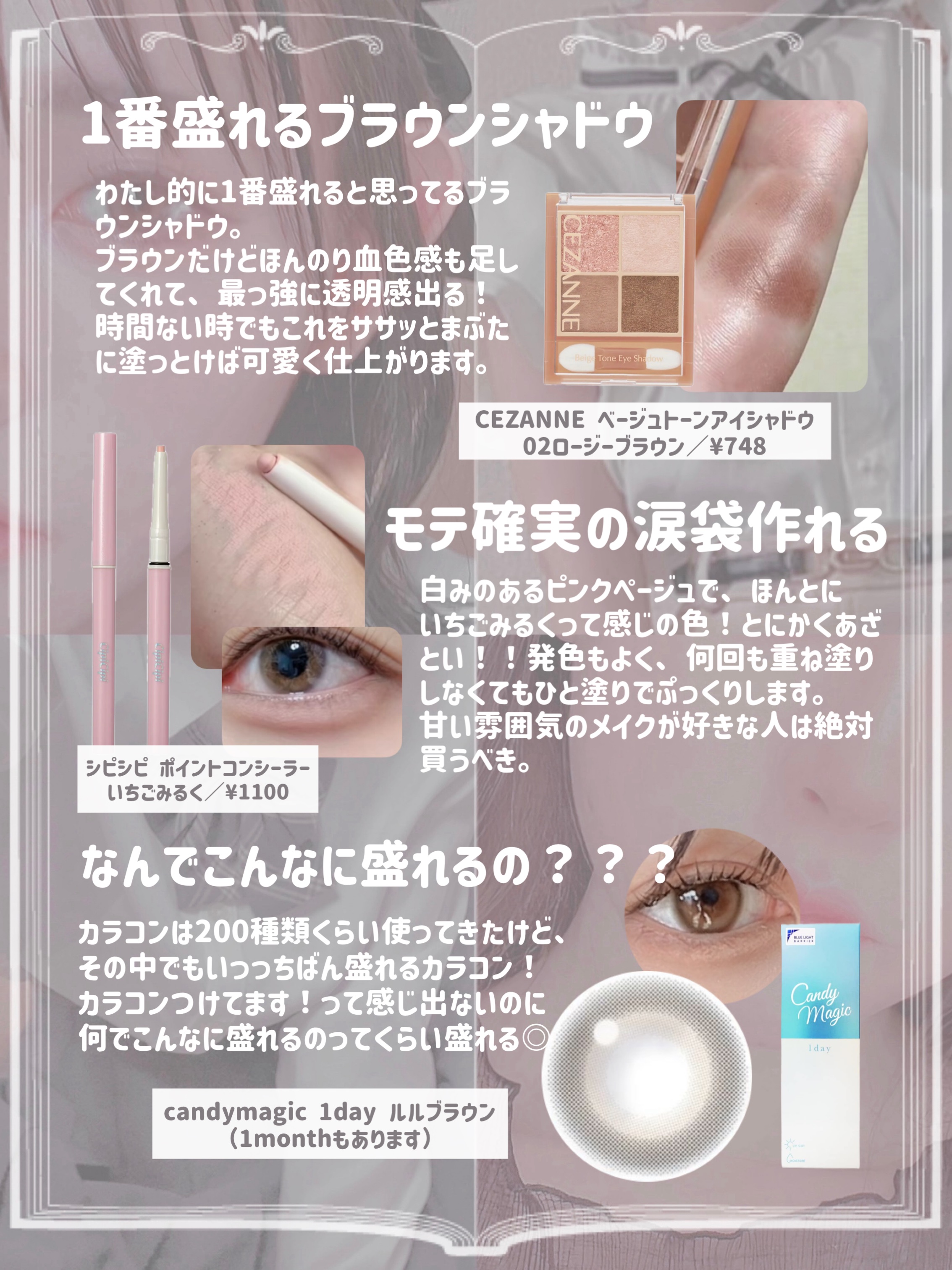rom&nd ベターザンパレット 01PAMPAS GARDEN キャンメイク アイバッグコンシーラー 02ピンクベージュ CEZANNE ストレッチコンシーラー 30オレンジ系 これどんなに濃いクマも消える◎ やり方は画像を見てください🫶🏻 ラメを使わずに盛りたい時や、あざとく盛りたい時におすすめ!