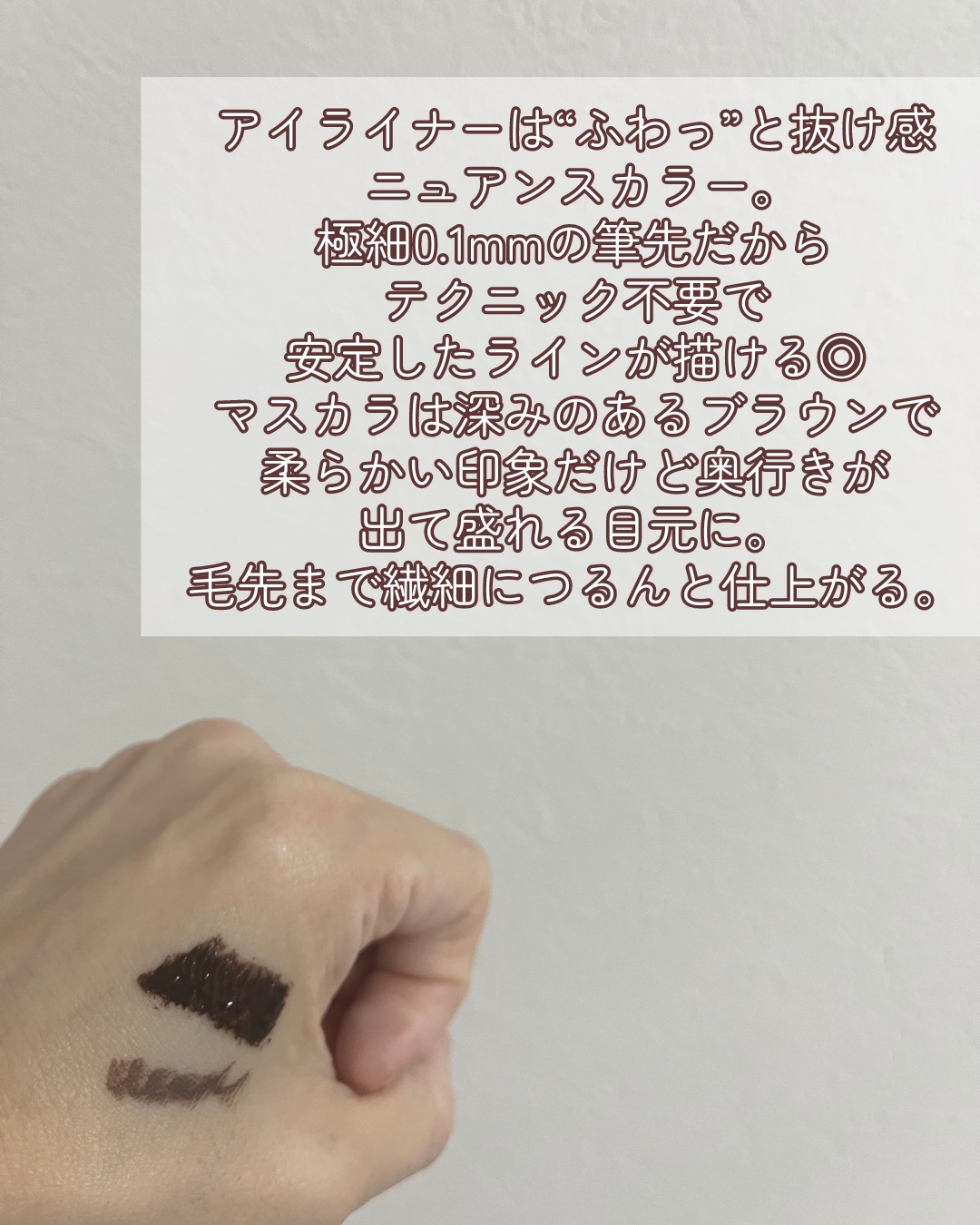 - 筆先までずっとなめらか、目尻で感動するリキッドアイライナー。 必要な量が肌にのる新設計で、まぶたの上をすべるような、滑らかな描き心地。しなやかでコシのある筆が、筆圧のコントロールを容易にし、太いラインも細いラインも思い通りに仕上げます。水、汗、涙に強いウォータープルーフタイプなのに、通常洗顔で簡単オフ。肌に色素が残らない顔料を使用。5種類の美容液成分を従来品の200%配合し、メイクしながら目元ケアまで。 ●ブラウンブラック ※2020年9月12日 バラエティショップ先行発売 ●漆黒ブラック ※2020年12月頃発売予定 ●ナチュラルブラウン ※2020年12月頃発売予定 ●シフォンブラウン 「毎日メイクに透明感と抜け感」 ブラウンでも、グレーでも、ベージュでもないニュアンスカラー。 自然な印影で素の目元を際立て、頑張りすぎない、ふんわりとした目元に。 ●アプリコットブラウン 「じゅわっと血色感。 肌に馴染むおしゃれカラー」 温かみのあるアプリコットがじゅわっと滲む血色感を目元に演出。 肌馴染みが良いので、カラーライナーに抵抗がある方もブラウンの延長線上で楽しめる、使いやすい色味です。 ”ちょっとオシャレ”な空気感を演出するカラー。 ●ピンクショコラ アイライナー 「ピンクが溶け込む濃厚ブラウン」 肌馴染みが良く、目元にじんわり血色感をプラス。 さりげなく女性らしさが加速するようなカラー。 ●ピスタチオラテ (2022年7月29日(金)発売) 「“目尻”に抜け感アクセント」 肌に馴染むのに映える絶妙なグリーン。 トレンドカラーに“くすみ”と“抜け感”をプラスしたまろやかな発色。 ●マスタードブラウン 「“イエロー”が揺れる、大人の洒落色」 (2022年7月29日(金)発売) まるで太陽のような暖かさを感じる新しいブラウン。 ほんのり感じるイエローでメイクが一気に垢抜ける稀有な色。 ●シフォンピンク(2023年2月10日発売) 「ふんわり柔らか"まろみピンク"」 甘くなりすぎない青みニュアンスで目元の透明感UP。 目元を引き締め、ピンクメイクにありがちな腫れぼったさを解消。 ●ミルクカプチーノ(2023年4月21日発売) まろやかな深みの“優しい締め色” どんなメイクにも合わせやすいカラー。 自然な陰影でさりげなく目幅を拡張します。 ●グレーカシミア(2023年10月1日発売) ブラウンがほんのり溶け込んだ、暖色グレー まろやかな発色で、パーソナルカラーを問わず肌に馴染む 目元の陰影になりすまし、抜け感と目力を欲張りに叶える ●ダークフィグ(2024年6月1日発売) するする”なめらか。描きやすいのに、落ちにくい。 クッキリ可愛いほの甘ダークブラウン ●ピーチモカ(2024年8月1日発売) ふわっと自然に盛れる“桃色ブラウン” ほんのり血色感で目元にうるみ感を演出 ●スターダストブラウン(2024年12月11日発売) キラッと繊細に輝く''星屑ブラウン'' 透け感のあるダークブラウンの色味とラメの輝きが、目元に艶のある立体感を演出 ●チャコールモカ(2025年4月10日発売) 目元を締める''深みグレージュ'' 黄みや赤みに偏りすぎない絶妙な色設計で、自然に目元を強調