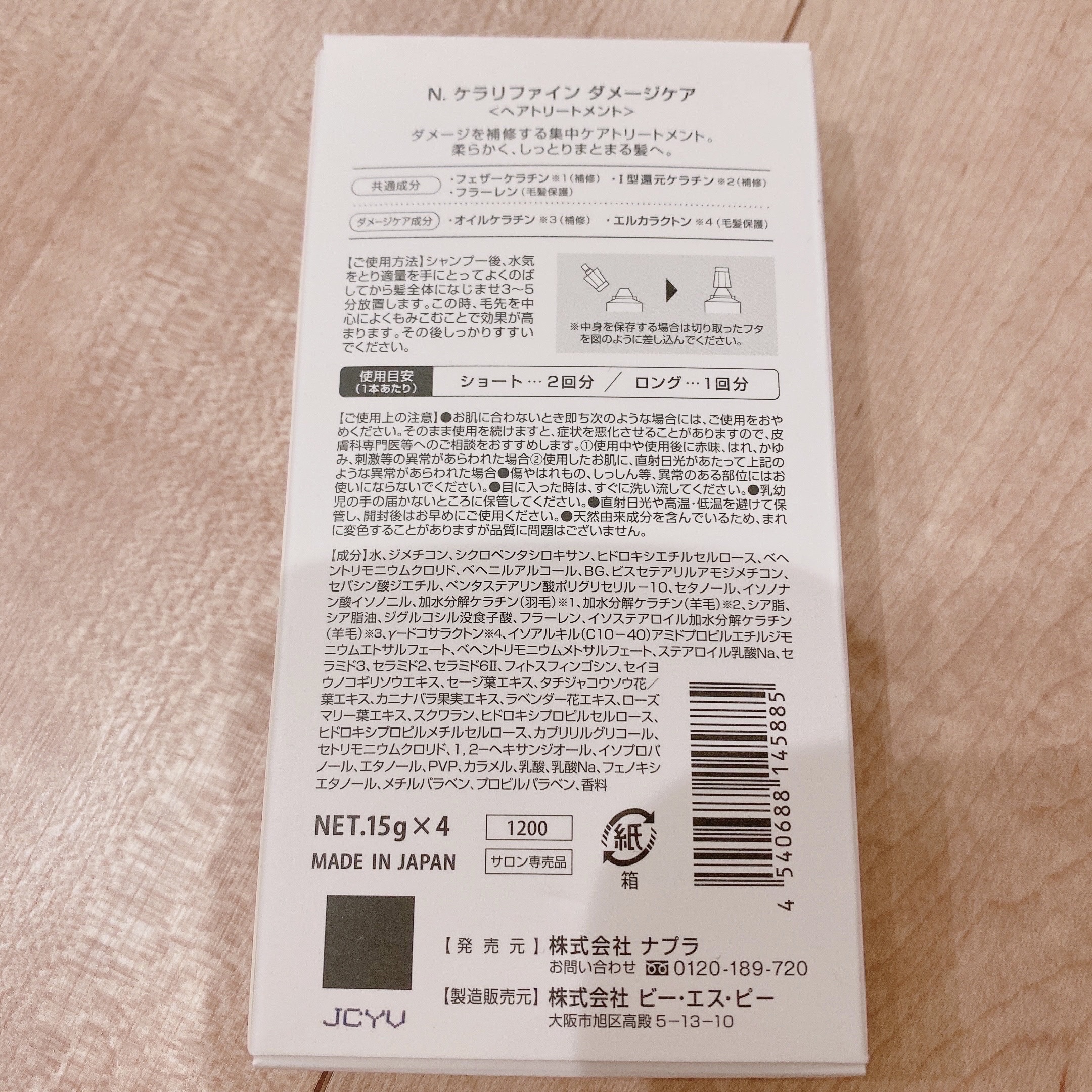 美容院でトリートメントをしたときにホームケア用にいただいたトリートメント👏 1箱4本入りです! 少しだけ多い気もしますが、残しとくのも面倒で…😂 香りは美容院っぽい、上品なトリートメントの香りがします🌸 髪全体に塗って、10分〜15分放置して流してます👌 流す瞬間から手触りが変わって、絹みたいに柔らかくなります!しっかりゆすいで乾かすと、断然まとまりよくなる🥺✨ 少し残念ポイントは、その日と翌日は調子いいんですが、次の日、その次の日と日が経つにつれて手触りもまとまり感もなくなっていくのが触り心地で分かります…🤔 4週かけて4回使ってみましたが、トリートメントして4日目5日目とかはもとの傷んだ髪にもどったかんじ… 効果のもちが少し短いかも?って感じました! 動画、蓋開けて中身を撮ろうと思ったのですがなかなか固くて開け方が分からず苦戦…諦めました🤣 後日使う時、落ち着いて捻れば普通に開きました!笑 半量使う場合は、フタを捨てずにとっておいて、フタ 反対側を差せばまたフタとして使えるので便利です👌