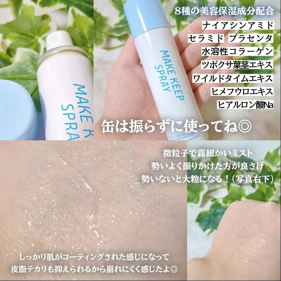 - メイクしたてが続くW処方。シュッとひと吹きでメイクをウォータープルーフ化※1し崩れを防ぐ。 MAKE KEEP:メイクコート成分が肌表面をコーティング、崩れを防ぎメイクしたてをキープ。 MOIST:たっぷりの美容成分で肌を保湿し、乾燥による皮脂テカリを防止。 ※1 効果には個人差があります。