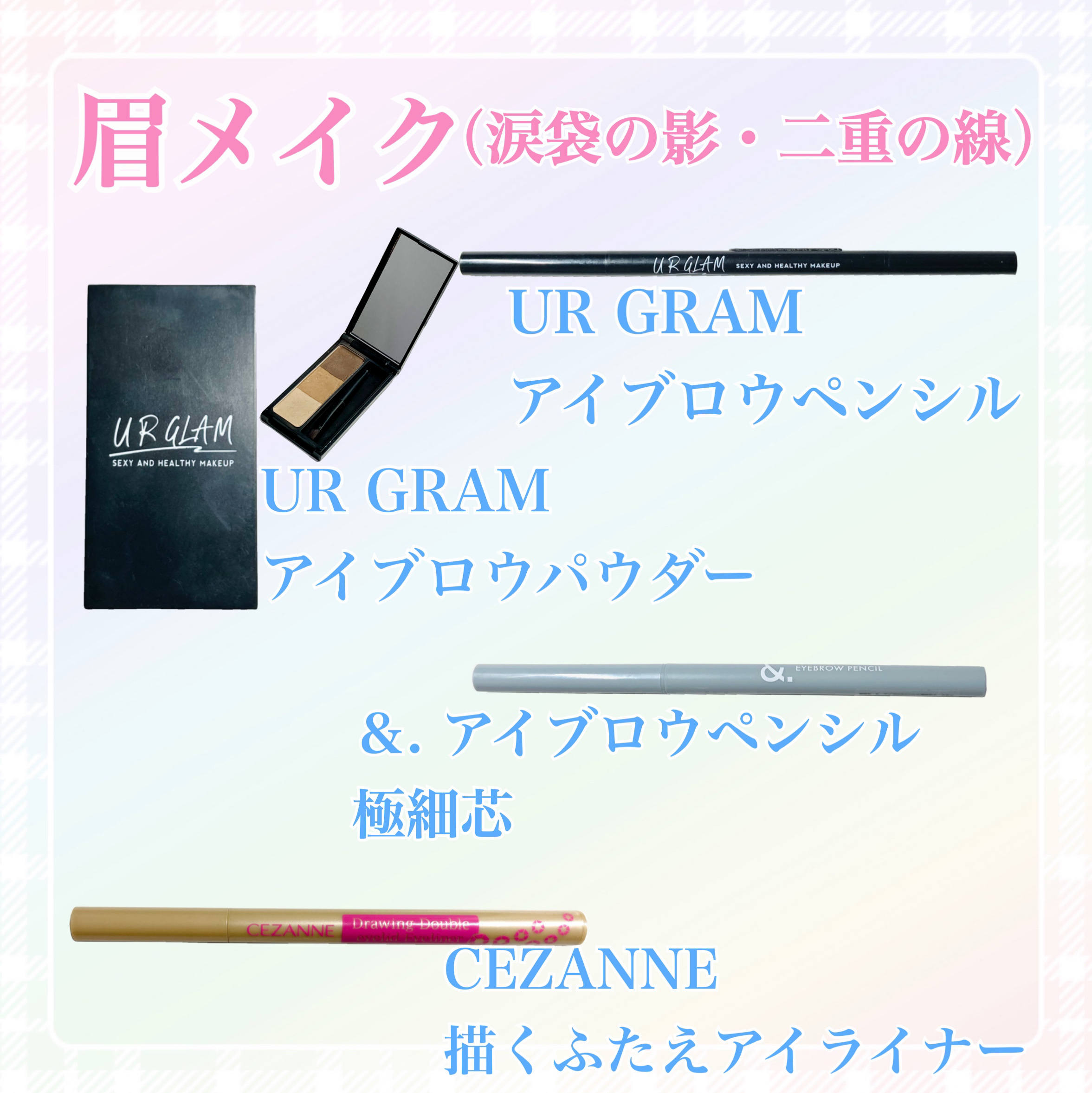 校則が厳しい方 →透明なピジョンの薬用固形パウダー 涙袋の影と二重の線は、セザンヌ描くふたえアイライナーを使った方が、仕上がりが綺麗になります。 涙袋に入れると、血色感が出て可愛くなります。