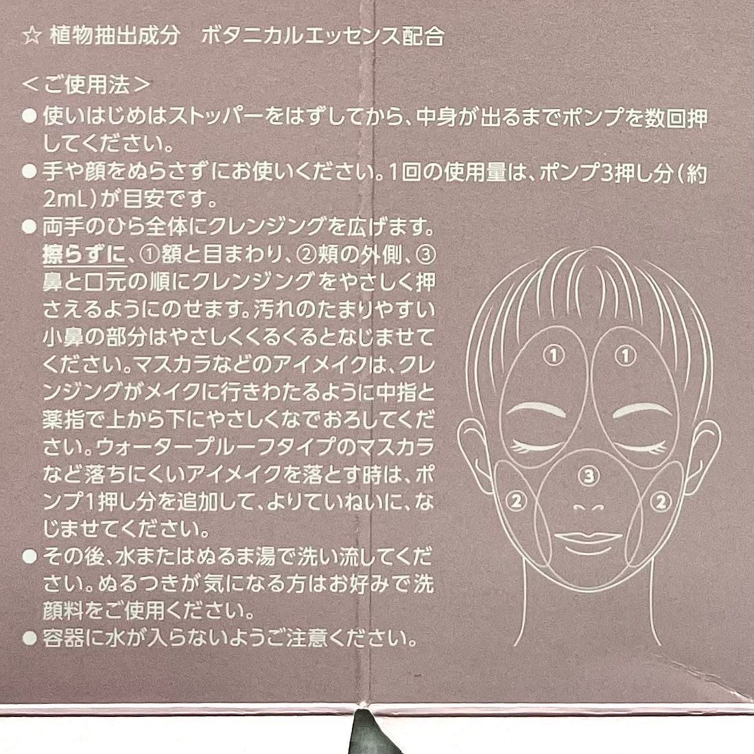 - ◇クレンジング 擦らず毛穴からメイクや 余 分な皮 脂をすっきり落とし、ニキビを防ぎます。 うるおいを保つバリア機 能を守って、なめらかに洗い上げるクレンジングです 。 ○肌にのせるだけでメイクを素 早く浮かせ 、擦らなくてもすすぎとともにメイクをするりと落とします 。アイメイクも軽くなじませるだけできれいに落とせます 。 ○ 1品でクレンジング、洗顔が完了します 。 ●まつ毛エクステンション対応※ ※シアノアクリレート系のグル ーを使用したまつ毛エクステンションに使えます 。 ☆ 植物抽出成分 ボタニカルエッセンス配合 ■使用方法 ●手や顔をぬらさずにお使いください 。1 回の使用量は、ポンプ 3 押し分( 約 2 m L )が目安です 。 ●両手のひら全 体にクレンジングを広げます。擦らずに、① 額と目まわり 、② 頬の外側 、③ 鼻と口元の順にクレンジングをやさしく押さえるようにのせます 。 汚れのたまりや すい小 鼻の 部 分 はやさしくくるくるとなじませてください 。 マスカラなどのアイメイクは 、クレンジングがメイクに行きわたるように中 指と薬指で上から下にやさしくなでおろしてください 。 ウォータープル ーフタイプのマスカラなど落ちにくいアイメイクを落とす時は 、ポンプ 1 押し分を追加して、よりていねいに、なじませてください 。 ●その後、水またはぬるま湯で洗い流してください。ぬるつきが気になる方はお好みで洗顔料をご使 用ください 。