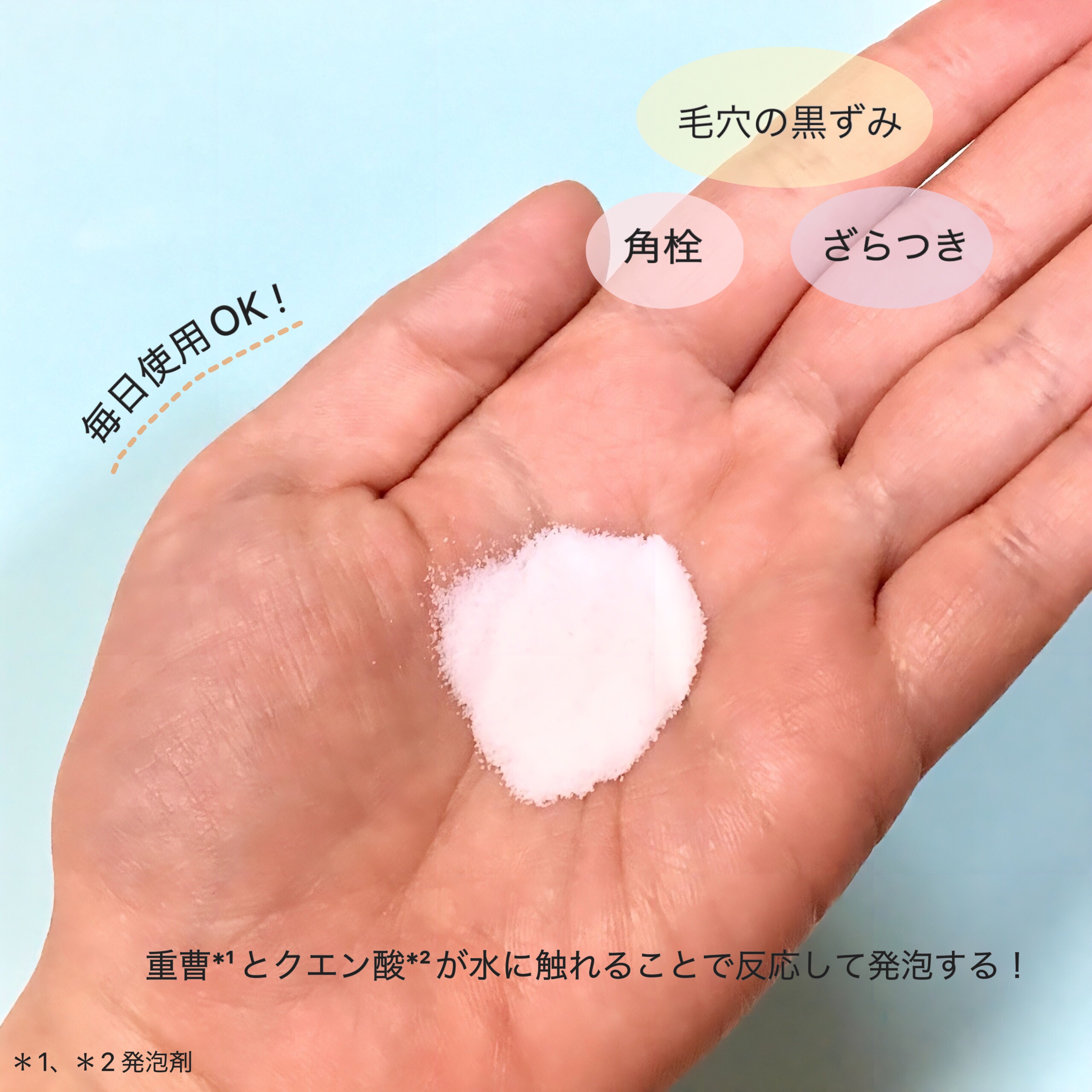 - 毛穴*1の中で躍る炭酸*2泡 ピーリング洗顔パウダー 重曹&クエン酸(発泡剤)が水に触れることで発泡して生まれ、躍るように動く毛穴より小さいミクロ炭酸泡。 しつこい角栓・毛穴の黒ずみ汚れ・肌表面の古い角質をしっかり落とし、くすみ*3・ざらつきをケアして明るい印象の透明感のあるつるつるなめらかな素肌に。 香料フリー・着色料フリー。 お肌を洗浄し、ニキビを防ぎます。洗顔後に使う化粧水がなじみやすい、なめらかな肌に整えます。 毎日ご使用いただけます。 お肌の状態に合わせてご使用ください。 *1角質層まで *2水に触れると重曹&クエン酸が反応 *3汚れや古い角質によるもの