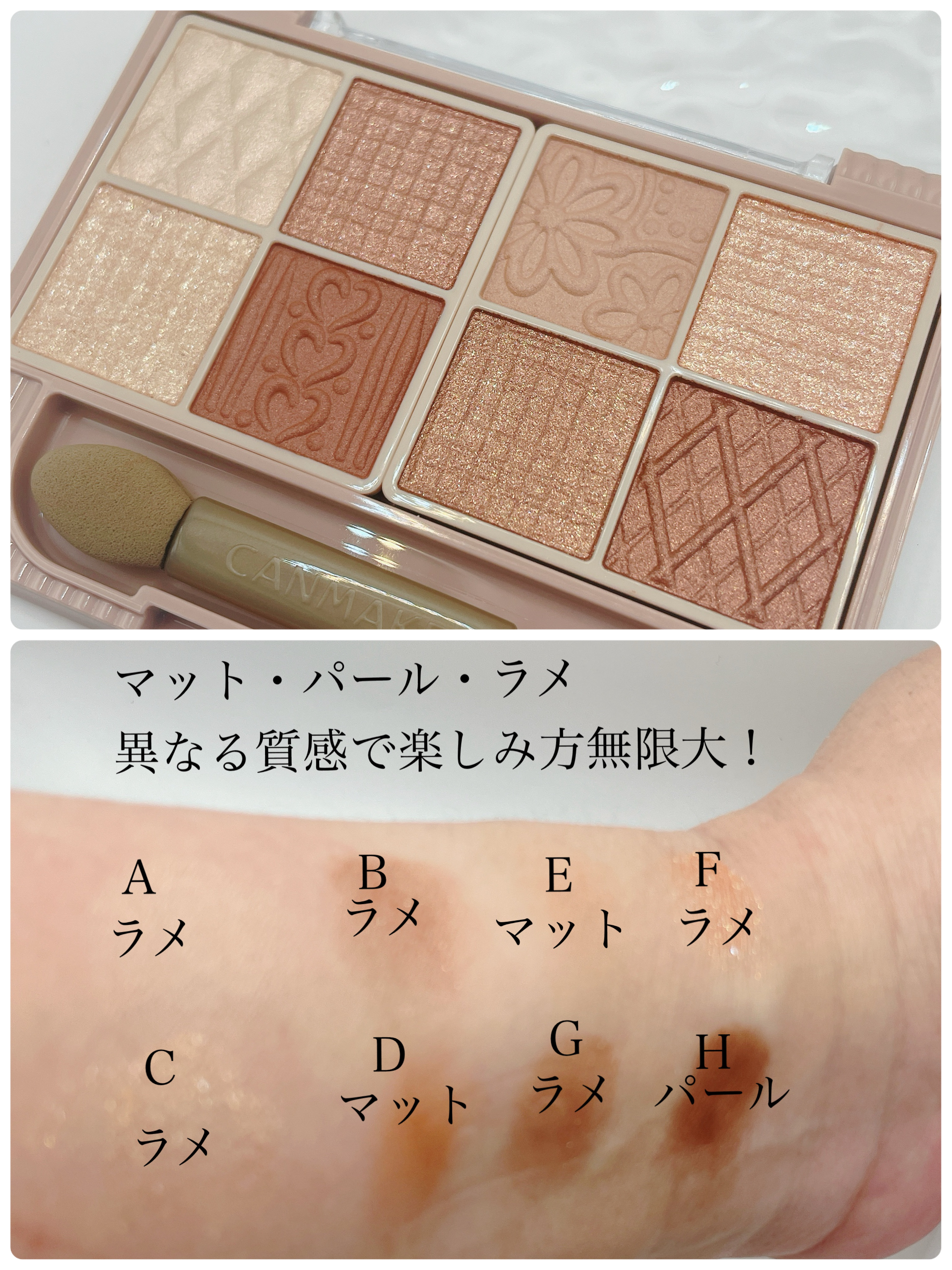 - 持ち歩ける多色パレットがキャンメイクから登場! 捨て色なしの8色入り&チップ付! 「持ち歩けること」や「外出先でもメイク直しができること」を重視した多色パレット。 持ち運びやすいサイズ感なのに、贅沢に8色入りです。 さらに便利なダブルエンドチップまで! マット×パール×ラメなど、組み合わせ方はあなたの自由! 自分好みのアイメイクを楽しめます。
