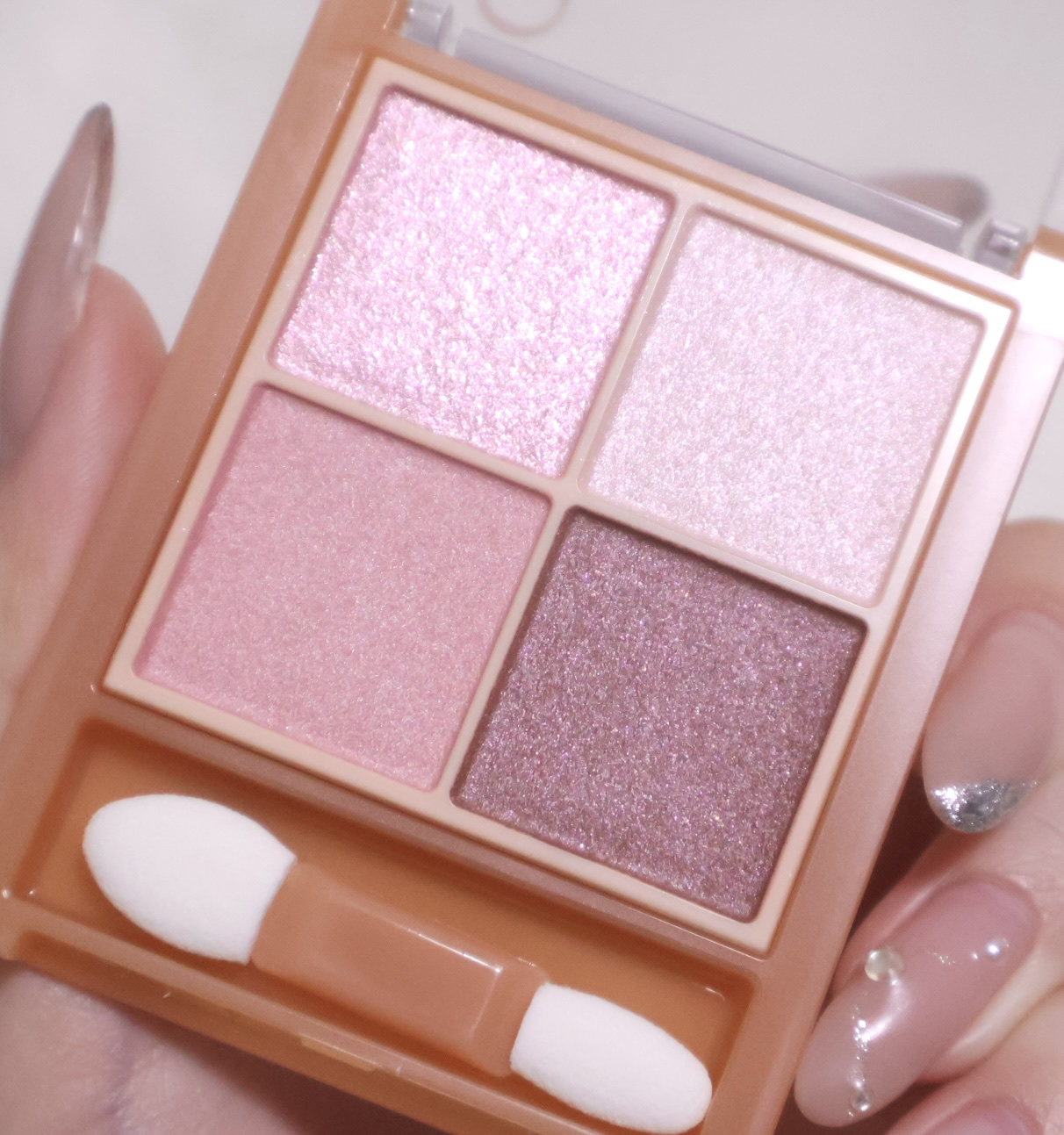 - ラメ・パール・マット3質感の4色アイシャドウ。 肌馴染みの良いベージュを基調としたカラー。ラメ・パール・マットの3質感を重ねて、自然にまぶたを強調し奥行のある大きな目元へ。 しっとり溶け込むような柔らかなパウダーなので、スルスル伸びてまぶたにピタッと密着。保湿成分(スクワラン・ホホバ種子油)配合。