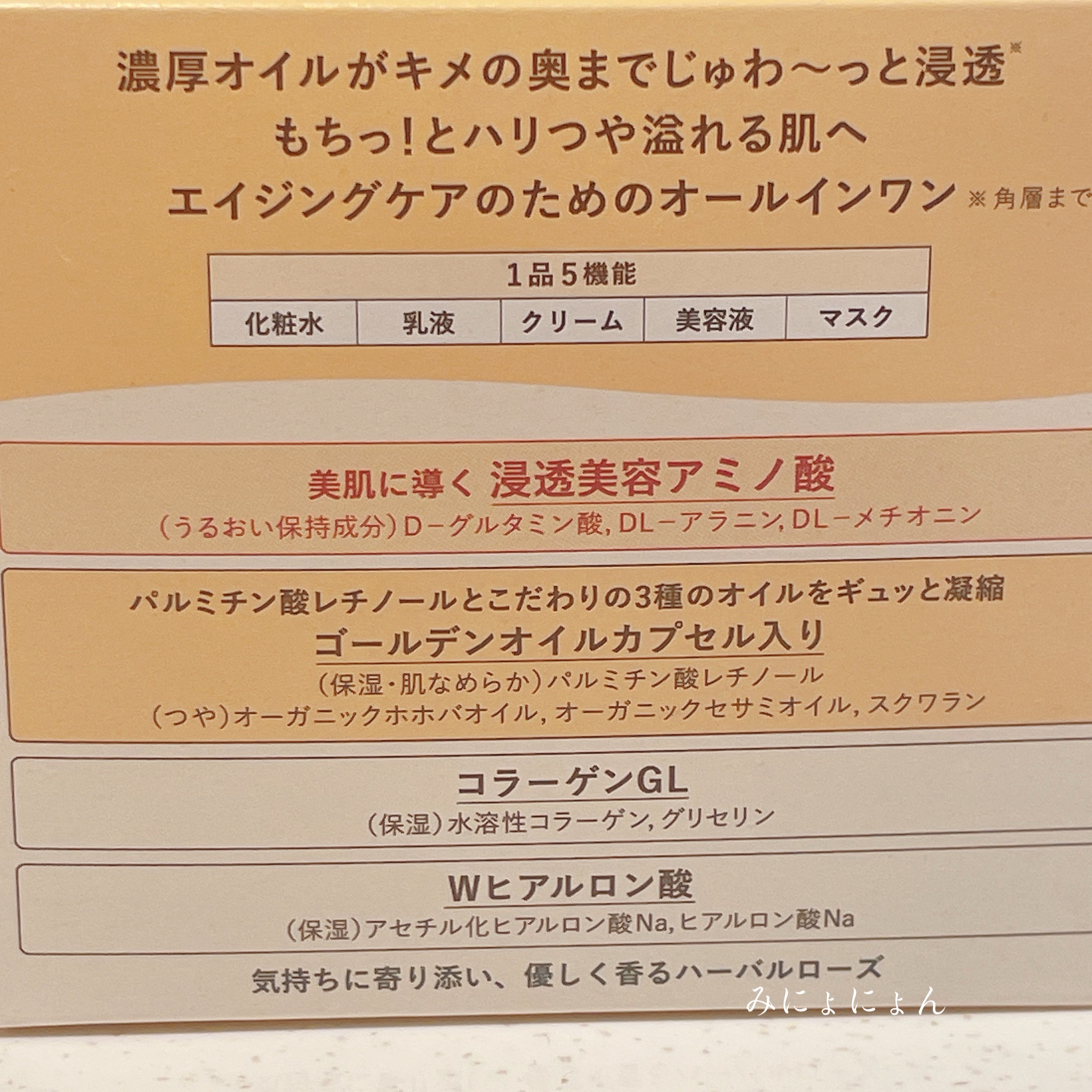 エイジングケアができるオールインワンで、これ1つでスキンケアの5役をしてくれます。 オイルインなのでしっとり保湿できるところも気に入っていました。 肌がふっくらしてもちもちになります。
