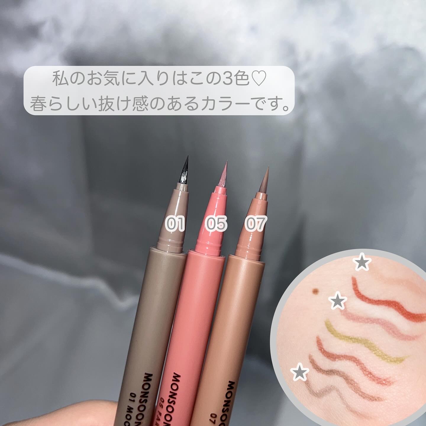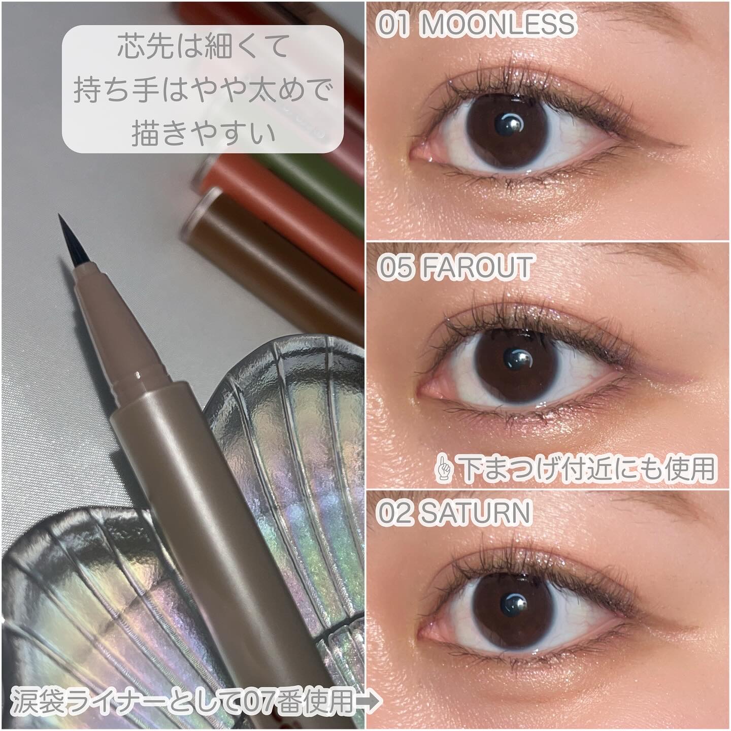 シアーで繊細ラメの夢かわカラーがかわいすぎ♡ これ…ニュアンス的な発色に繊細ラメがさり気なくて、めちゃくちゃかわいくて使いやすい!! アレンジ自由自在♫ 今回はライラックメイクに04を上は目頭から、下は目尻に入れてみたけど、さり気ない発色と繊細パールがかわいすぎる🥹🩷 筆先も0.1mmと細くて、適度にコシがあるから使いやすいよ! 全色買いしても気分とメイクで楽しめちゃうよ。