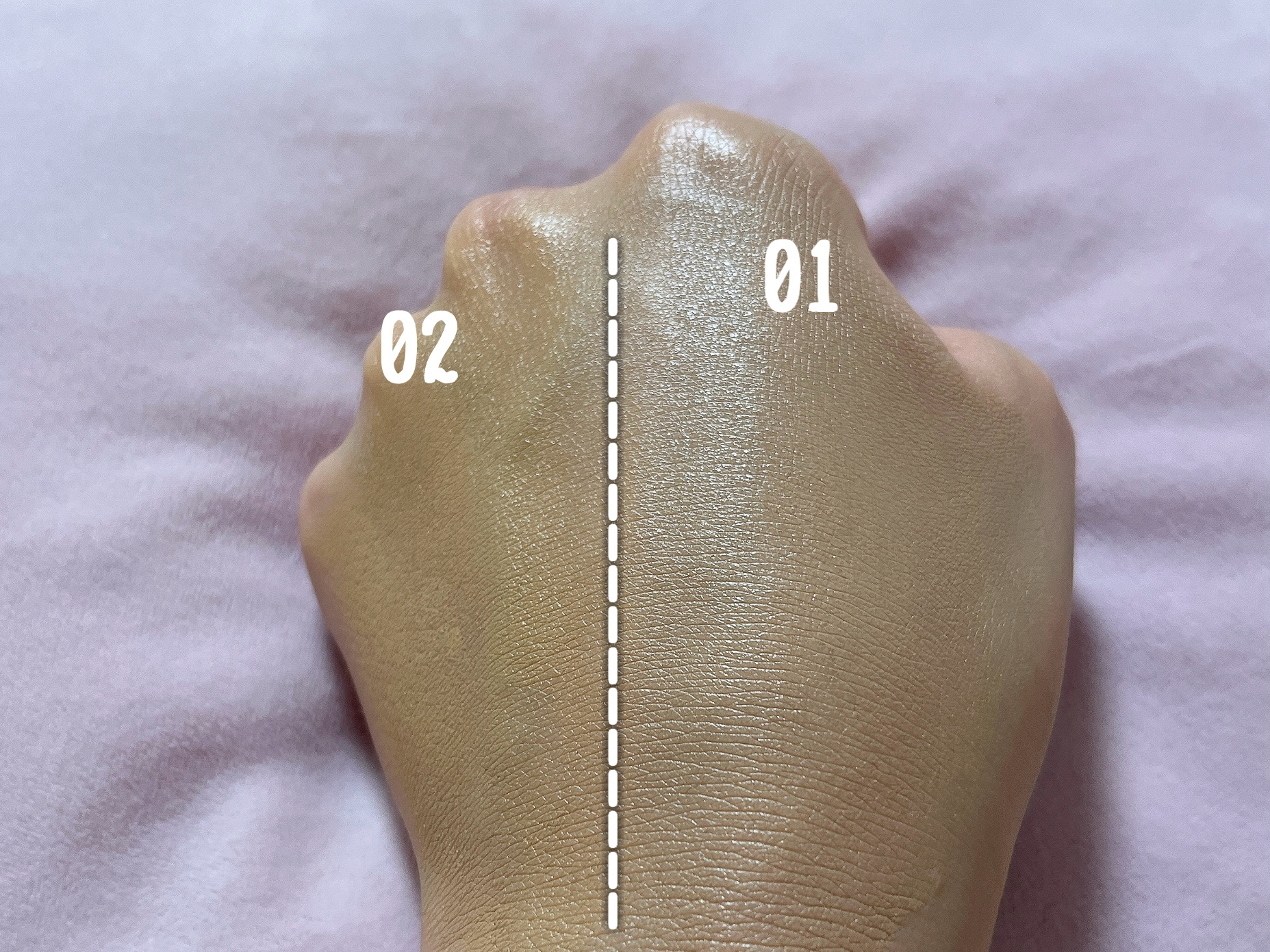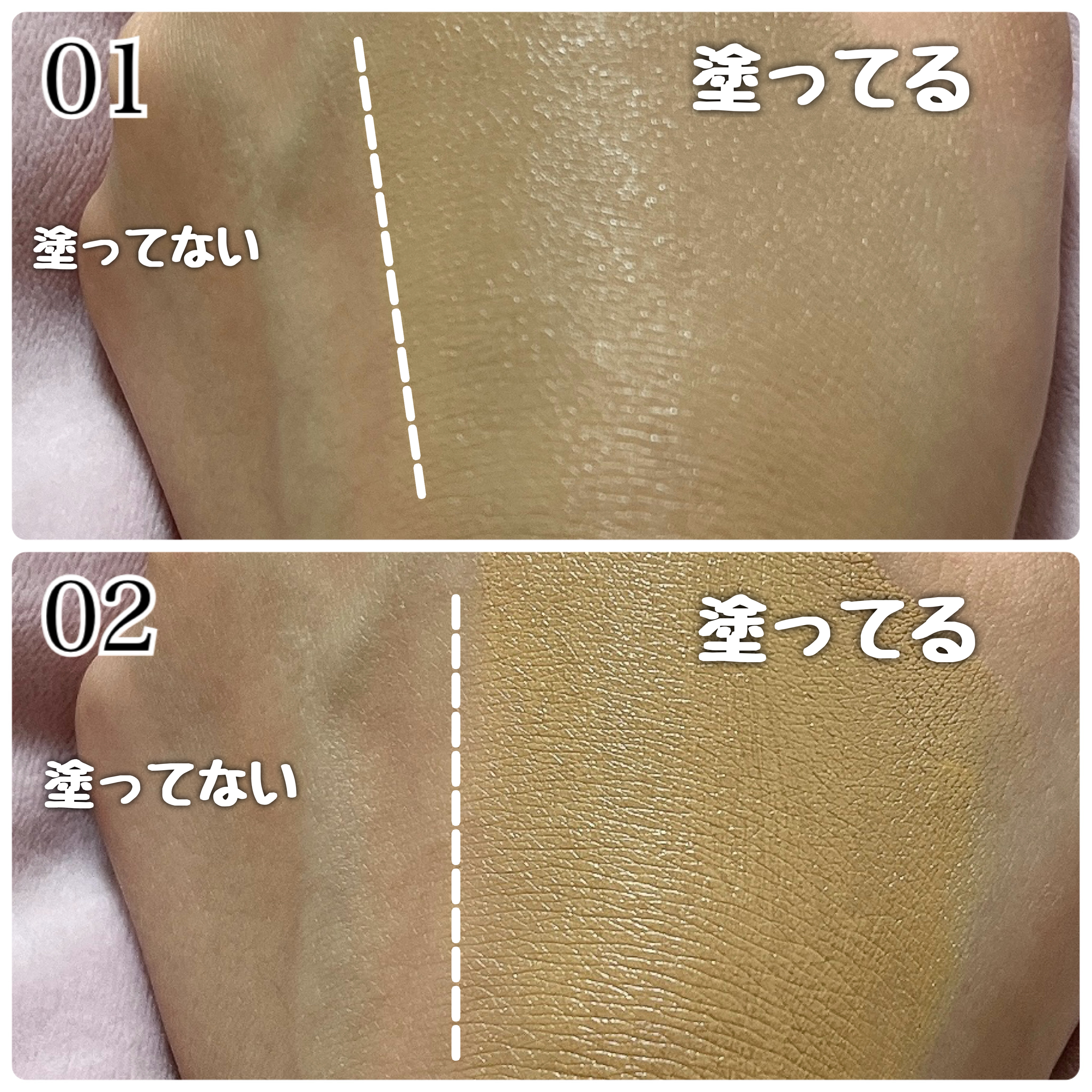 - <01 ライト> 水、酸化チタン、メトキシケイヒ酸エチルヘキシル、グリセリン、ドロメトリゾールトリシロキサン、ジメチコン、変性アルコール、テレフタリリデンジカンフルスルホン酸、PG、ジエチルアミノヒドロキシベンゾイル安息香酸ヘキシル、TEA、ビスエチルヘキシルオキシフェノールメトキシフェニルトリアジン、ステアリン酸、酸化鉄、セチルリン酸K、ペンチレングリコール、水酸化Al、BHT、BG、シアバター油粕エキス、カプリリルグリコール、カルボマー、カルノシン、セタノール、EDTA-2Na、ステアリン酸グリセリル、ミリスチン酸、ミリスチルアルコール、パルミチン酸、ステアリン酸PEG-100、フェノキシエタノール、塩化Na、ココイルサルコシンNa、ステアリルアルコール、トコフェロール、トロメタミン、キサンタンガム <02 ナチュラル> 水、酸化チタン、メトキシケイヒ酸エチルヘキシル、グリセリン、ドロメトリゾールトリシロキサン、ジメチコン、変性アルコール、テレフタリリデンジカンフルスルホン酸、PG、ジエチルアミノヒドロキシベンゾイル安息香酸ヘキシル、TEA、酸化鉄、ビスエチルヘキシルオキシフェノールメトキシフェニルトリアジン、ステアリン酸、セチルリン酸K、ペンチレングリコール、水酸化Al、BHT、BG、シアバター油粕エキス、カプリリルグリコール、カルボマー、カルノシン、セタノール、EDTA-2Na、ステアリン酸グリセリル、ミリスチン酸、ミリスチルアルコール、パルミチン酸、ステアリン酸PEG-100、フェノキシエタノール、塩化Na、ココイルサルコシンNa、ステアリルアルコール、トコフェロール、トロメタミン、キサンタンガム