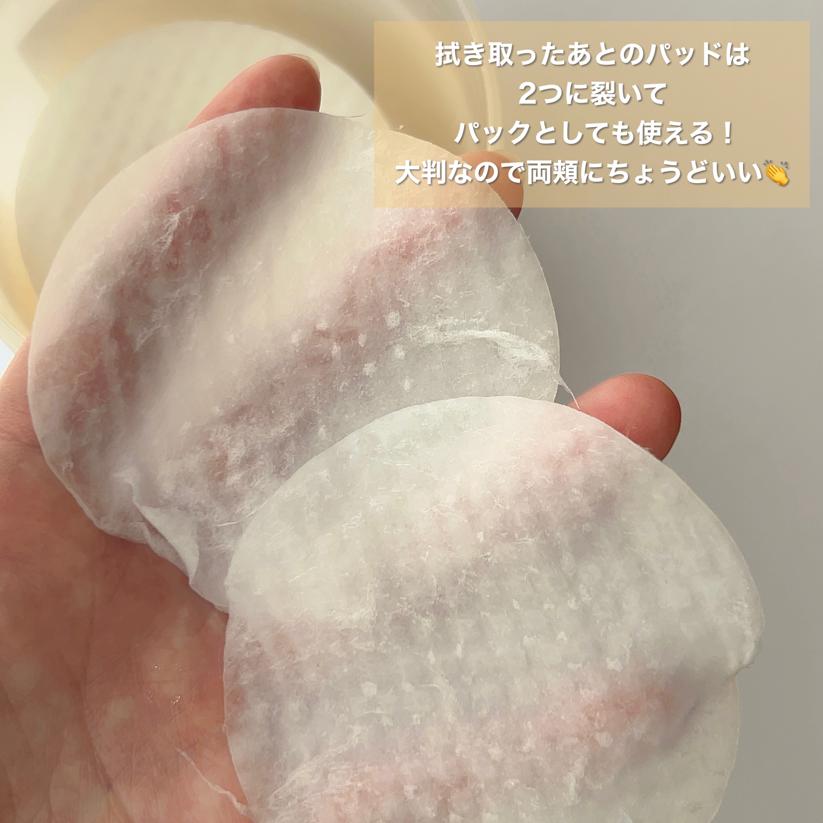 パッドが厚く、ふわふわなので摩擦レスでお肌への負担が少ない! 1枚1枚に美容液がひたひたなのも嬉しい❤︎ これを使うと余分な汚れが拭き取りつつ、しっかり水分チャージしてくれるので、化粧ノリが全然違いました🥹💓 拭き取り化粧水として使用したあとは2枚に裂いて、パックとして使用できるので保湿力も高く日中も乾燥しなかったです! 時間が無い朝に短時間でスキンケアできるのは本当にありがたい! 私は確実にリピします!✨
