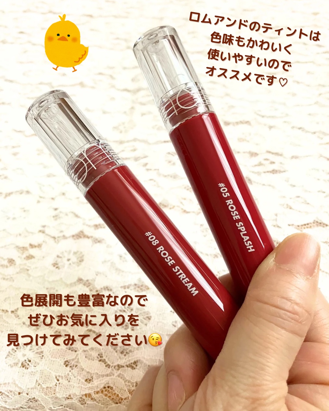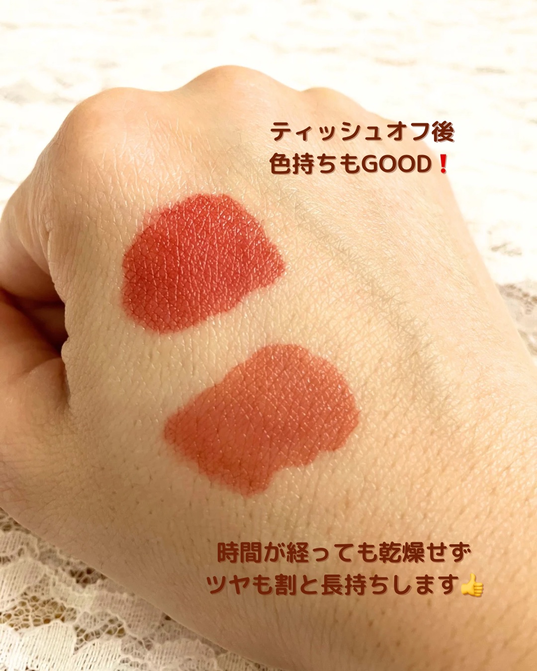 このティントは色味が最強に可愛く普段使いしやすいのでほぼ毎日使ってます(^^) 派手になりすぎずナチュラルかつ唇に血色感をあたえてくれるのでとても重宝しています♡ また色持ちが良いところもお気に入りポイントです!!