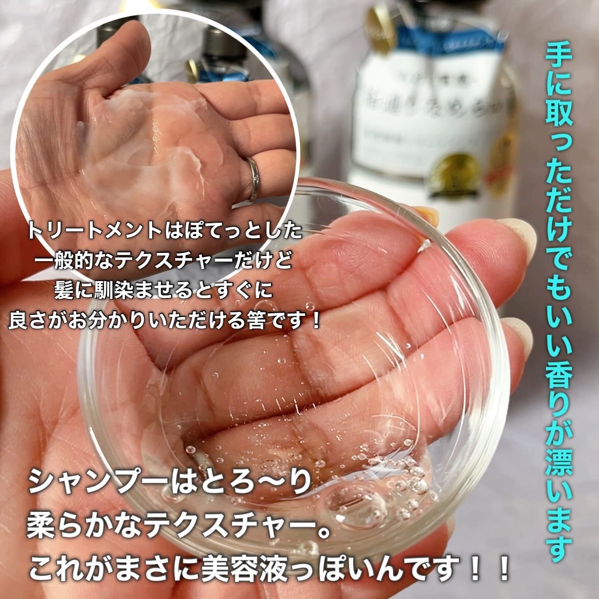 - とろけるような柔らかな質感と、毛先までツヤめくサラふわな指通りに導く美容液シャンプー/浸透補修トリートメント。 カシミヤ由来のケラチンをはじめとする3種のケラチン、シルクPPT&コラーゲンPPT、CMC類似成分などのこだわって配合した補修成分だけでなく、セラミド、ヒアルロン酸、オーガニックオイルなどの美容保湿成分をたっぷり配合することで、繰り返すカラーや熱ダメージによるパサつき・広がり・ゴワつきなどの蓄積ダメージにもしっかりアプローチ。 (シャンプー) 補修ケアはもちろん、ダメージ毛にも配慮したなめらかな洗い心地を追求し、アミノ酸系洗浄成分だけでなくPPT系洗浄成分も贅沢配合のこだわり抜いた処方で、キシまずとろけるようになめらかな洗い上りに。 (トリートメント) 髪の外部・内部から同時に髪の1本1本を包み込んでダメージ部分を疎水化することで、指通りやツヤ感だけでなく髪の質感を整えます。 また熱を利用して髪を補修するヒートリペア成分も配合。 ドライヤーなどの熱から髪を守り、同時にダメージケアも。 清楚な上品さを纏うホワイトフローラル&ペア―の香り。