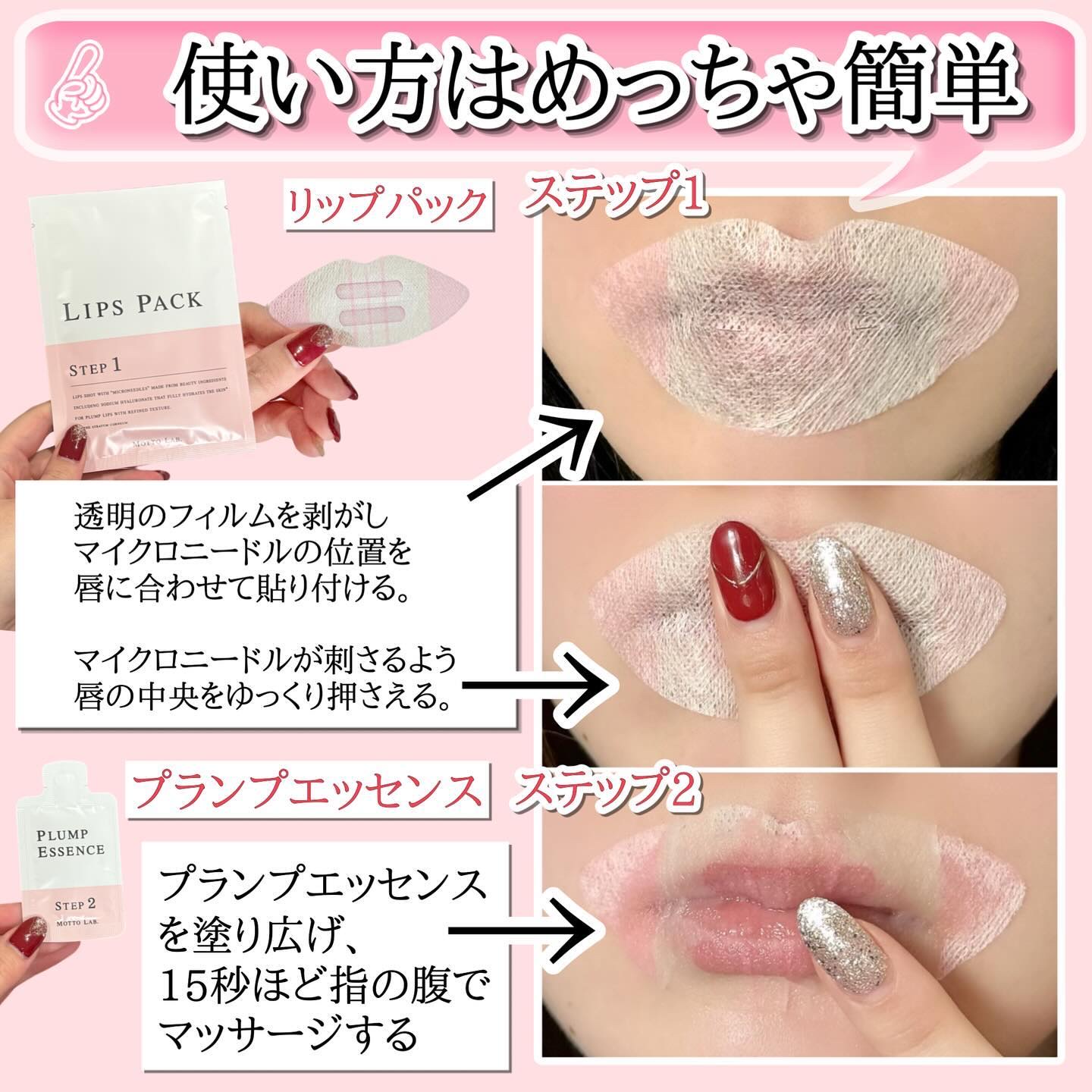 - LIPS SHOTは唇を自然にふっくらさせる唇専用パックです。唇をふっくらさせるヒアルロン酸Naなどのプランプ成分を、針状に結晶化した独自開発のマイクロニードルで、塗るだけでは届かないプランプ成分を唇の角質層までダイレクトに届けることができます。 [セット内容] ・モットラボ リップパック(シート状美容液/1回分) ・モットラボ プランプエッセンス(唇用美容液/2g)