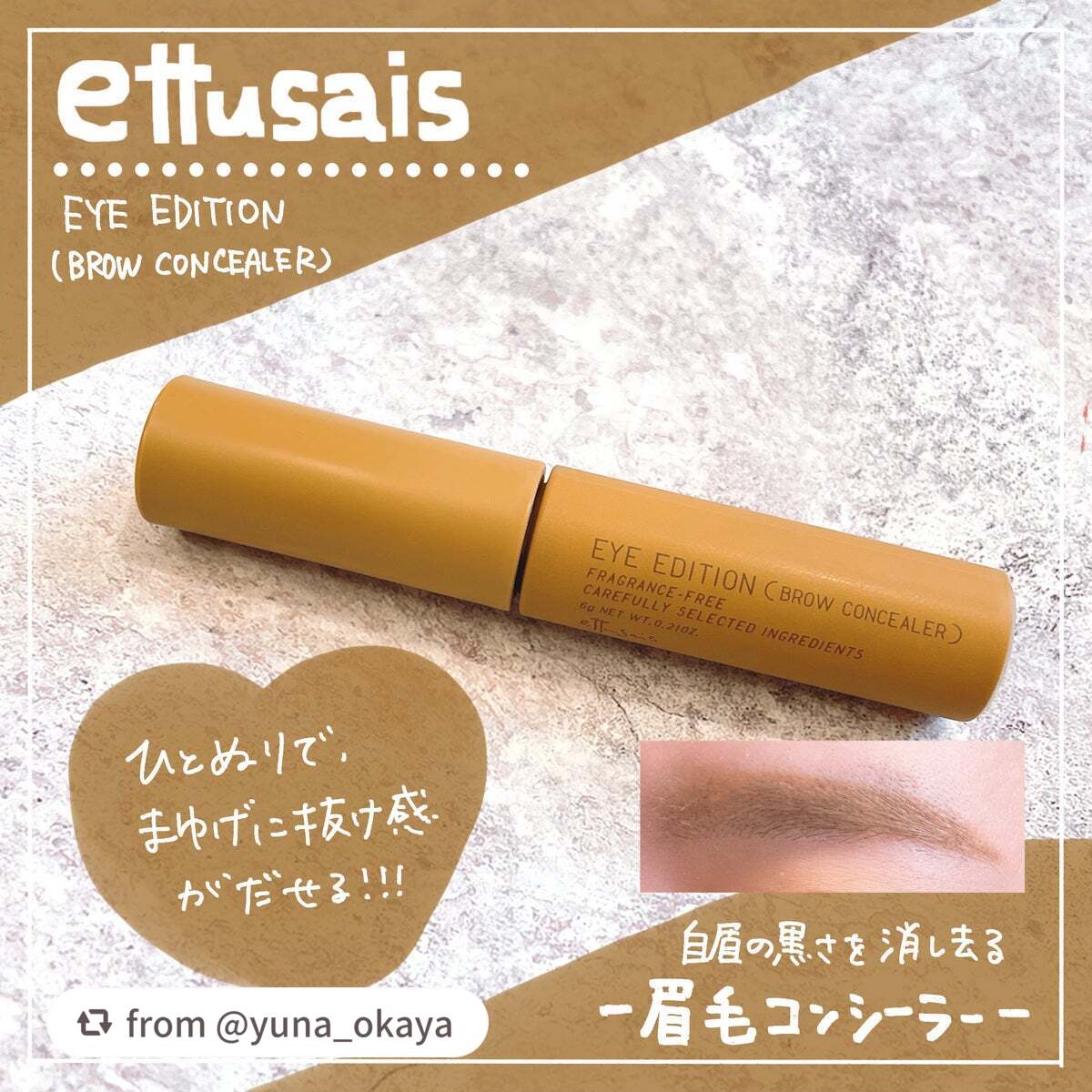 - ひと塗りで垢抜け!自眉の黒さをやわらげる、眉毛コンシーラー。 これ1本で抜け感仕上げ。眉マスカラを重ねれば、思い通りの発色に。 〇濃い眉毛をしっかりカバーし、自眉の印象をやわらげる。さらに眉マスカラを重ねれば、思い通りの発色に。 ーアッシュパール配合 〇眉毛に均一につき、ダマになりにくいストレートソフトブラシ採用。 〇ウォータープルーフ 〇汗、皮脂に強く、美しい仕上がりが長時間持続。 〇美容液成分配合 ー毛髪トリートメント(アミノ酸成分)、毛髪保湿成分(ヒアルロン酸)配合 〇単品でご使用の場合は、洗顔料で落とせる。 〇無香料 〇アレルギーテスト済(すべての方にアレルギーが起きないというわけではありません) 2024年4月18日(木)全国発売<4月4日(木)一部先行発売>