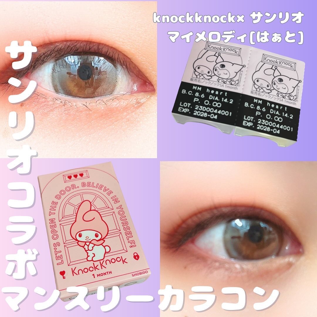 knockknock1monthマイメロディきのこパーティ¥1,408SHOBIDOなんと、マイメロディとクロミのイラストがコンタクトレンズに入ったカラコンです!!1ヶ月使用できるみたいで、1日目しっかり使ってみましたが目の乾燥は感じませんで...