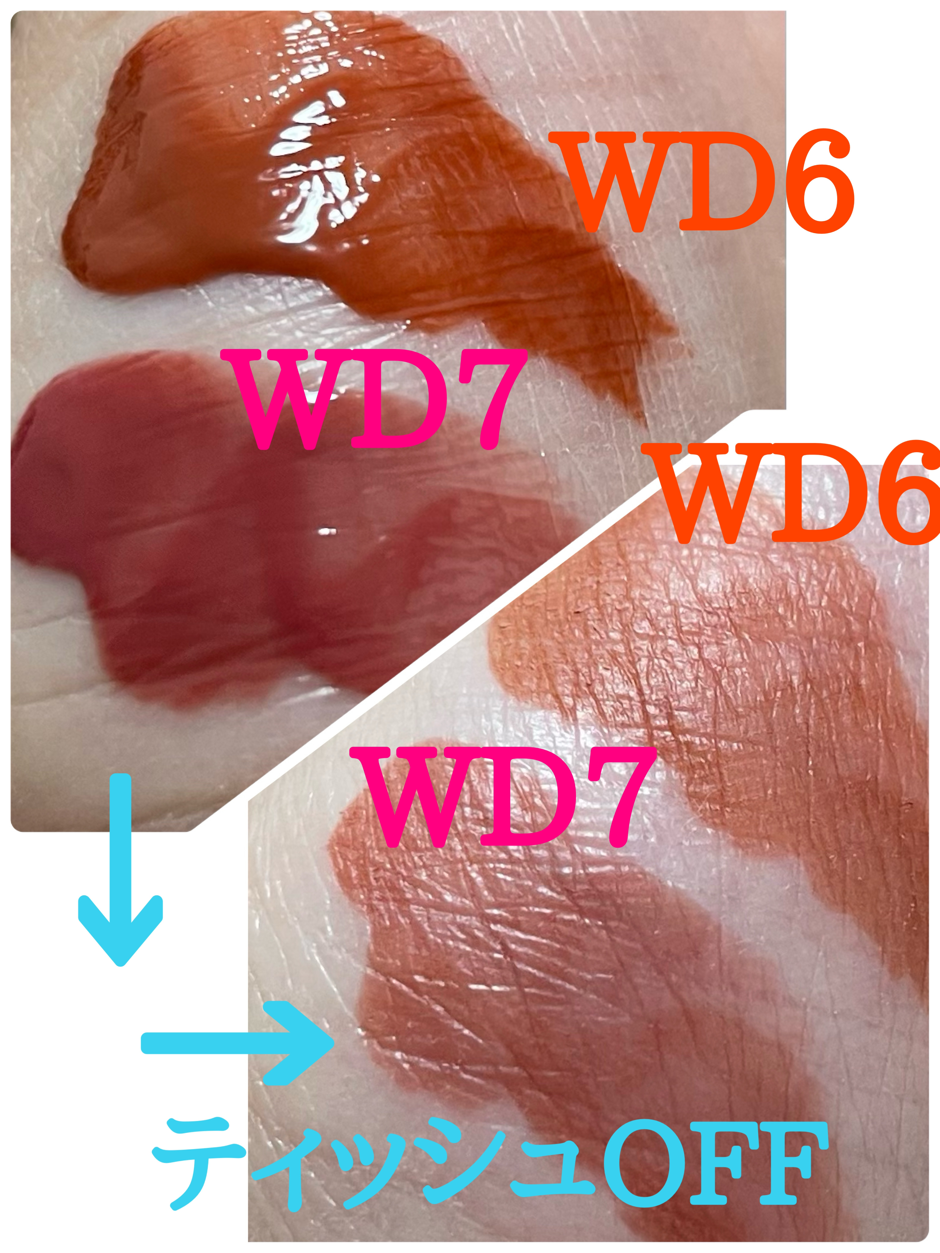 - <WD2 ビトゥン ローズ> 水、ジフェニルジメチコン、リンゴ酸ジイソステアリル、ビスジグリセリルポリアシルアジペート-2、水添ポリイソブテン、ジグリセリン、DPG、セチルPEG/PPG-10/1ジメチコン、イソステアリン酸ソルビタン、ポリソルベート60、ペンチレングリコール、オクチルドデカノール、セテアレス-20、(アクリル酸ヒドロキシエチル/アクリロイルジメチルタウリンNa)コポリマー、スクワラン、フェノキシエタノール、ポリグリセリン-3、ステビオシド、香料、エチルヘキシルグリセリン、グリセリン、シア脂、ツバキ種子油、トリ(カプリル酸/カプリン酸)グリセリル、アルガニアスピノサ核油、ホホバ種子油、アーモンド油、アンズ核油、月見草油、オリーブ果実油、テトラ(ジ-t-ブチルヒドロキシヒドロケイヒ酸)ペンタエリスリチル、カニナバラ果実エキス、マンゴー果実エキス、赤104(1)、赤227、黄5、青1 <WD3 ピンク ヘイズ> 水、ジフェニルジメチコン、リンゴ酸ジイソステアリル、ビスジグリセリルポリアシルアジペート-2、水添ポリイソブテン、ジグリセリン、DPG、セチルPEG/PPG-10/1ジメチコン、イソステアリン酸ソルビタン、ポリソルベート60、ペンチレングリコール、オクチルドデカノール、セテアレス-20、(アクリル酸ヒドロキシエチル/アクリロイルジメチルタウリンNa)コポリマー、スクワラン、フェノキシエタノール、ポリグリセリン-3、ステビオシド、香料、エチルヘキシルグリセリン、グリセリン、水酸化Al、ポリアクリル酸アンモニウム、BG、アルガニアスピノサ核油、シア脂、ツバキ種子油、トリ(カプリル酸/カプリン酸)グリセリル、アーモンド油、アンズ核油、ホホバ種子油、月見草油、オリーブ果実油、テトラ(ジ-t-ブチルヒドロキシヒドロケイヒ酸)ペンタエリスリチル、マンゴー果実エキス、カニナバラ果実エキス、酸化チタン、赤104(1)、赤227、黄5、青1 <WD4 オールウェイズ ヤング> 水、ジフェニルジメチコン、リンゴ酸ジイソステアリル、ビスジグリセリルポリアシルアジペート-2、水添ポリイソブテン、ジグリセリン、DPG、セチルPEG/PPG-10/1ジメチコン、イソステアリン酸ソルビタン、ポリソルベート60、ペンチレングリコール、オクチルドデカノール、セテアレス-20、(アクリル酸ヒドロキシエチル/アクリロイルジメチルタウリンNa)コポリマー、スクワラン、フェノキシエタノール、ポリグリセリン-3、ステビオシド、香料、エチルヘキシルグリセリン、グリセリン、シア脂、ツバキ種子油、トリ(カプリル酸/カプリン酸)グリセリル、アルガニアスピノサ核油、ホホバ種子油、アーモンド油、アンズ核油、月見草油、オリーブ果実油、テトラ(ジ-t-ブチルヒドロキシヒドロケイヒ酸)ペンタエリスリチル、カニナバラ果実エキス、マンゴー果実エキス、赤104(1)、赤227、黄5、青1 <WD6 クラッシュド パンプキン> 水、水添ポリイソブテン、リンゴ酸ジイソステアリル、ビスジグリセリルポリアシルアジペート-2、ジフェニルシロキシフェニルトリメチコン、ジフェニルジメチコン、ポリグリセリン-3、オクチルドデカノール、ポリソルベート60、セチルPEG/PPG-10/1ジメチコン、ラウリン酸ポリグリセリル-10、ペンチレングリコール、1,2-ヘキサンジオール、(アクリル酸ヒドロキシエチル/アクリロイルジメチルタウリンNa)コポリマー、PEG-60水添ヒマシ油、セテアリルアルコール、スクワラン、キシリトール、エチルヘキシルグリセリン、香料、ポリアクリル酸アンモニウム、イソステアリン酸ソルビタン、水酸化Al、フェノキシエタノール、BG、トコフェロール、酸化チタン、酸化鉄、赤227、黄4、黄5、青1 <WD8 ビンテージ カラント> 水、水添ポリイソブテン、リンゴ酸ジイソステアリル、ビスジグリセリルポリアシルアジペート-2、ジフェニルシロキシフェニルトリメチコン、ジフェニルジメチコン、オクチルドデカノール、ポリグリセリン-3、ポリソルベート60、セチルPEG/PPG-10/1ジメチコン、ラウリン酸ポリグリセリル-10、1,2-ヘキサンジオール、ペンチレングリコール、(アクリル酸ヒドロキシエチル/アクリロイルジメチルタウリンNa)コポリマー、PEG-60水添ヒマシ油、セテアリルアルコール、スクワラン、キシリトール、エチルヘキシルグリセリン、香料、イソステアリン酸ソルビタン、トコフェロール、赤104(1)、赤227、黄5、青1 <WD9 ミスター ストレンジャー> 水、水添ポリイソブテン、リンゴ酸ジイソステアリル、ビスジグリセリルポリアシルアジペート-2、ジフェニルシロキシフェニルトリメチコン、ジフェニルジメチコン、オクチルドデカノール、ポリグリセリン-3、ポリソルベート60、セチルPEG/PPG-10/1ジメチコン、ラウリン酸ポリグリセリル-10、1,2-ヘキサンジオール、ペンチレングリコール、(アクリル酸ヒドロキシエチル/アクリロイルジメチルタウリンNa)コポリマー、セテアリルアルコール、PEG-60水添ヒマシ油、スクワラン、キシリトール、エチルヘキシルグリセリン、香料、イソステアリン酸ソルビタン、水酸化Al、ポ