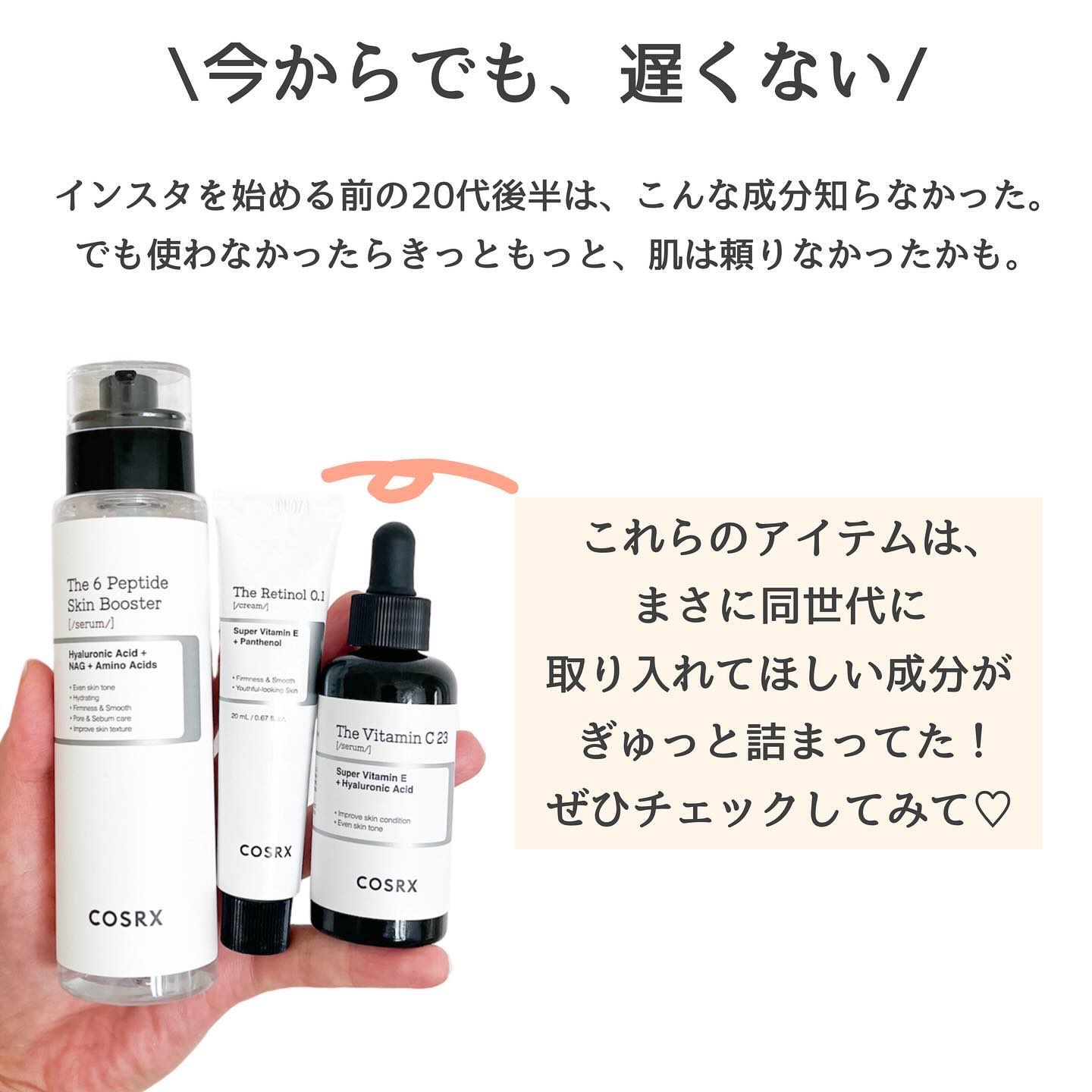 ペプチド成分が贅沢に6種類も配合。毛穴にアプローチし、毛穴の黒ずみや皮脂吸着に役立つ成分で、たるみ、しわ等老化を遅らせ色素沈着も抑える。 生ビタミンCが23%も高配合され、美白はもちろんシミやそばかすまで薄くできる効果がある#シミの消しゴム レチノール濃度が0.1%と鎮静成分が一緒に配合され、A反応が苦手な方やレチノール初心者、花粉のシーズンにも安心して使える。