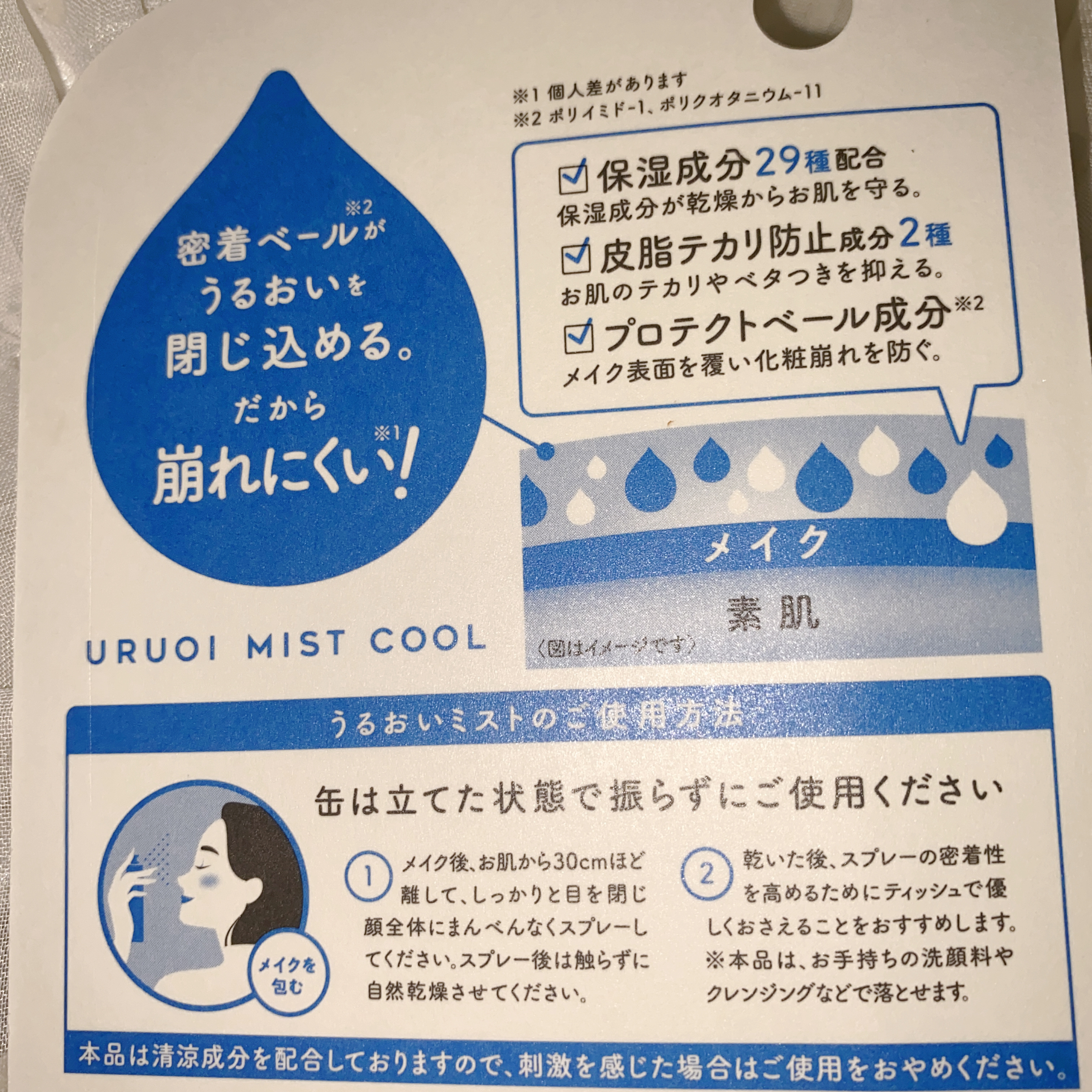 - メイクを長時間カバーするメイクカバリングスプレーのクール版が期間限定で新登場。 メイクの上からサッとスプレーするだけで、素早くお肌をクールダウン。メイクを覆う皮膜成分に加え、保湿成分と皮脂抑制成分を配合。お肌に潤いを与えつつ、汗・乾燥・皮脂などによるメイク崩れの原因を素早くブロックします。お肌への負担を考えたノンシリコンスプレーです。