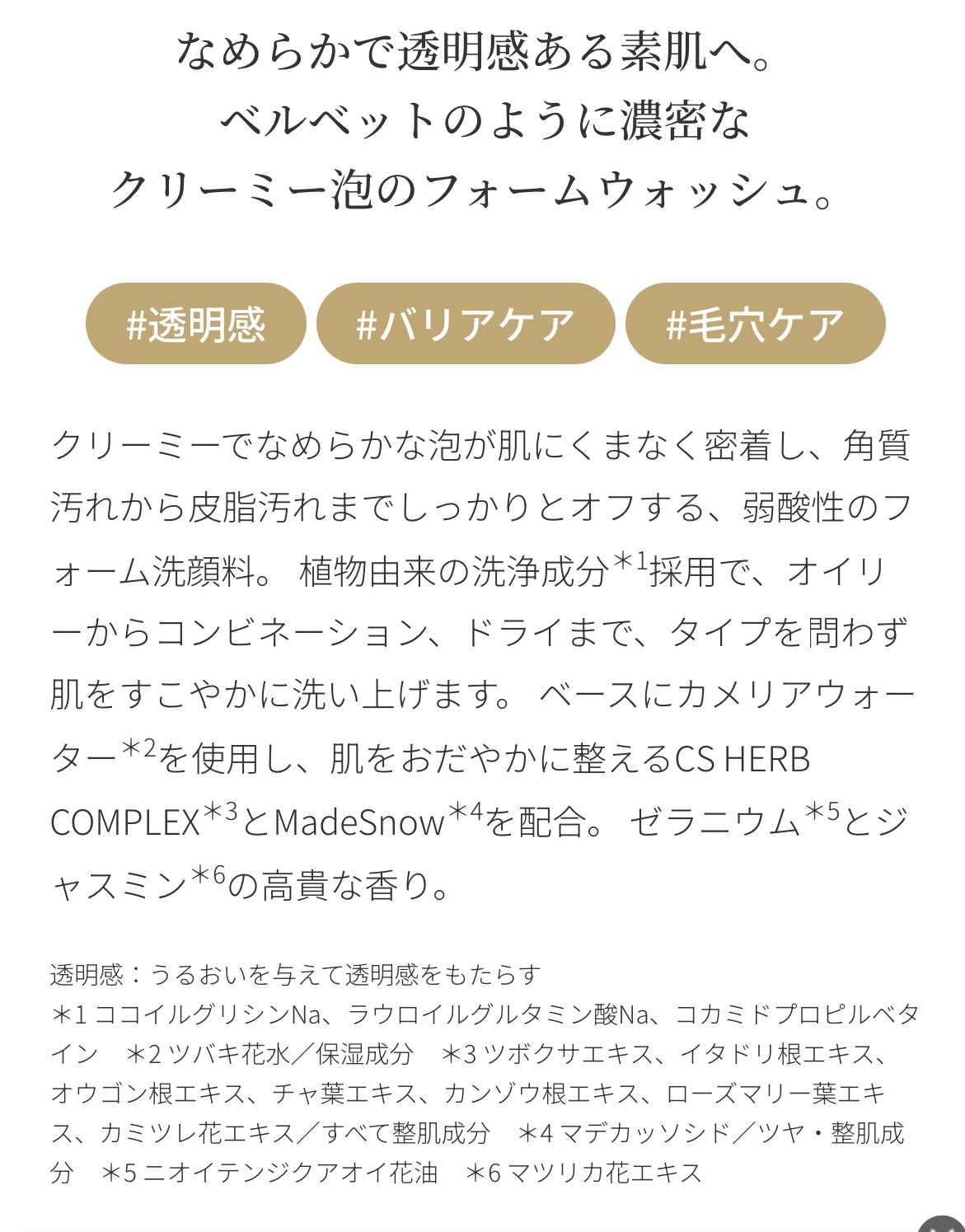 - ベルベットのように濃密なクリーミー泡が肌に密着してなめらかに洗い上げる、弱酸性フォーム洗顔料 クリーミーでなめらかな泡が肌にくまなく密着し、角質汚れから皮脂汚れまでしっかりとオフする弱酸性のフォーム洗顔料。植物由来の洗浄成分採用で、オイリーからコンビネーション、ドライまで、タイプを問わず肌をすこやかに洗い上げます。ベースにカメリアウォーター*1を使用し、肌の調子を整えるCS HERB COMPLEX*2とMade Sow*3を配合。ゼラニウム*5とジャスミン*6の高貴な香り。 *1ツバキ花水 *2ツボクサエキス、イタドリ根エキス、オウゴン根エキス、チャ葉エキス、カンゾウ根エキス、ローズマリー葉エキス、カミツレ花エキス *3マデカッソシド *5ニオイテンジクアオイ花油 *6マツリカ花エキス