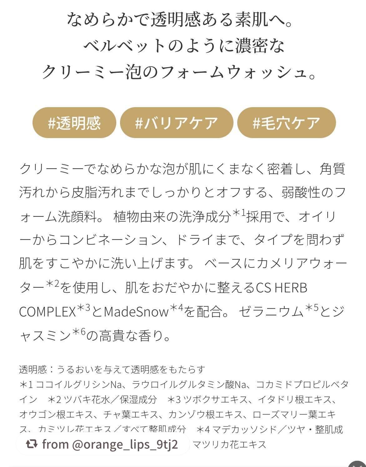 - ベルベットのように濃密なクリーミー泡が肌に密着してなめらかに洗い上げる、弱酸性フォーム洗顔料 クリーミーでなめらかな泡が肌にくまなく密着し、角質汚れから皮脂汚れまでしっかりとオフする弱酸性のフォーム洗顔料。植物由来の洗浄成分採用で、オイリーからコンビネーション、ドライまで、タイプを問わず肌をすこやかに洗い上げます。ベースにカメリアウォーター*1を使用し、肌の調子を整えるCS HERB COMPLEX*2とMade Sow*3を配合。ゼラニウム*5とジャスミン*6の高貴な香り。 *1ツバキ花水 *2ツボクサエキス、イタドリ根エキス、オウゴン根エキス、チャ葉エキス、カンゾウ根エキス、ローズマリー葉エキス、カミツレ花エキス *3マデカッソシド *5ニオイテンジクアオイ花油 *6マツリカ花エキス