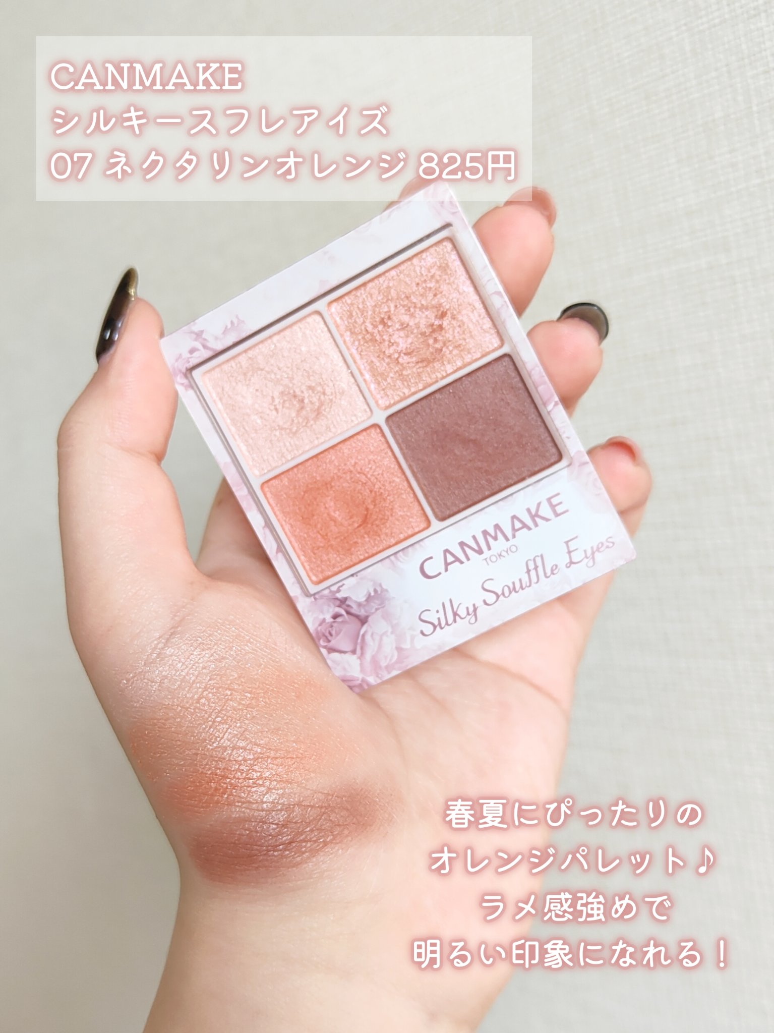 【春色オレンジ♡華やかな透けツヤカラー】キャンメイクシルキースフレアイズ07ネクタリンオレンジ825円(税込)繊細パールでツヤのある立体感まぶたにしあげてくれるプチプラアイシャドウ♡今回使った「07ネクタリンオレンジ」はジューシーなオレンジと...