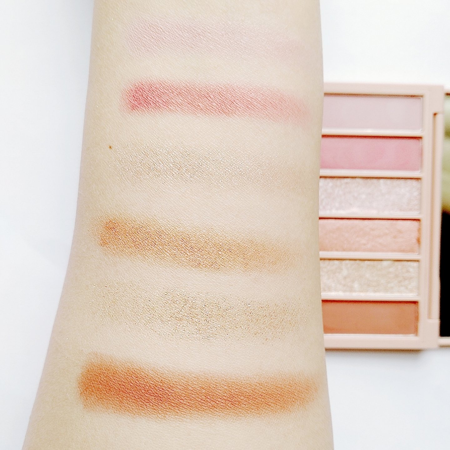 プチプラのクオリティじゃないっ!! 発売前からチェックしていたけれど、ここまで可愛いとは…😆 絶妙カラーで目もとのくすみを飛ばして*明るい印象に🩷 横割りグラデーションでメイクし、立体感をより出したかったので最後に1番左のカラーを上まぶたの真ん中と涙袋にのせています🙆 肌馴染みも良くて粉飛びも感じにくかったです💕 ブラウンの方も店頭に出てたら買おうかな💓