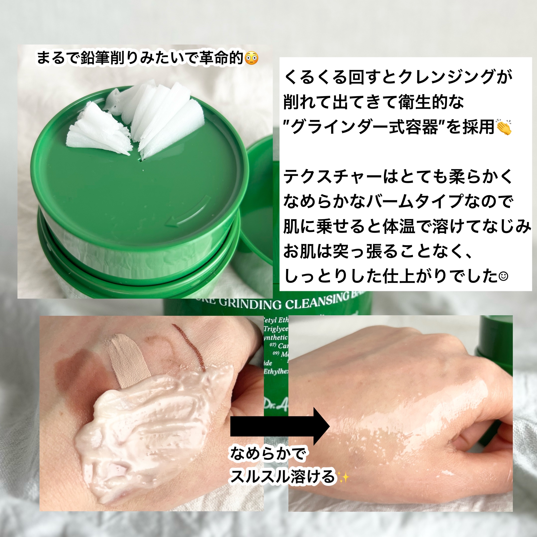 - メイクを落としながら肌のケアをしてくれるクレンジングバーム。 とろけるバームが毛穴汚れや皮脂を包み込むようにオフし、肌への摩擦を軽減。 グラインダー式容器で、必要なだけクレンジングバームを挽くだけなので、衛生的。