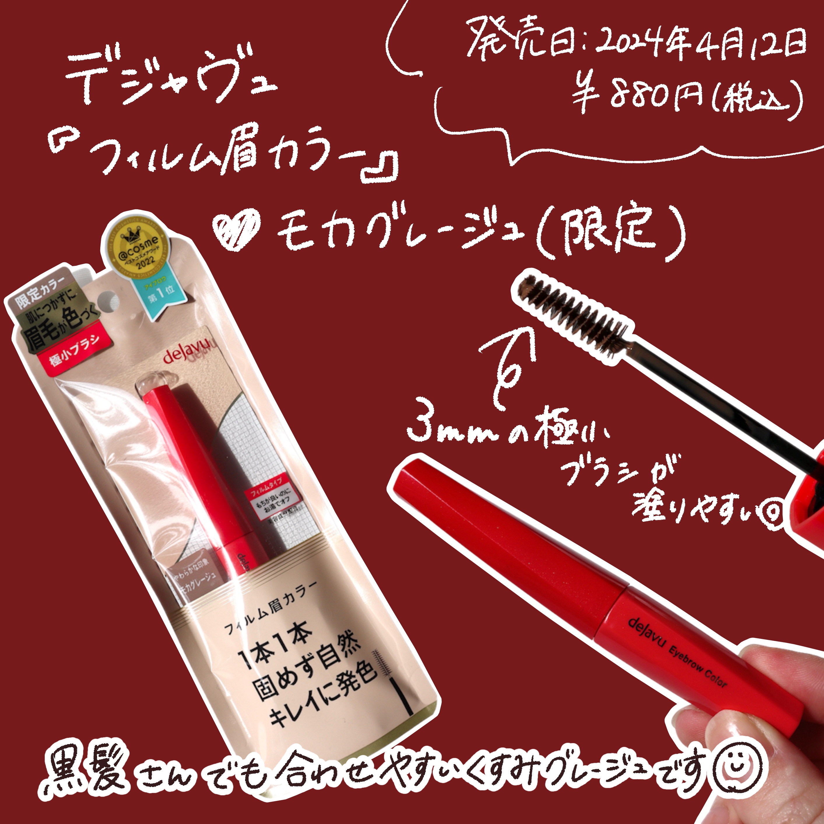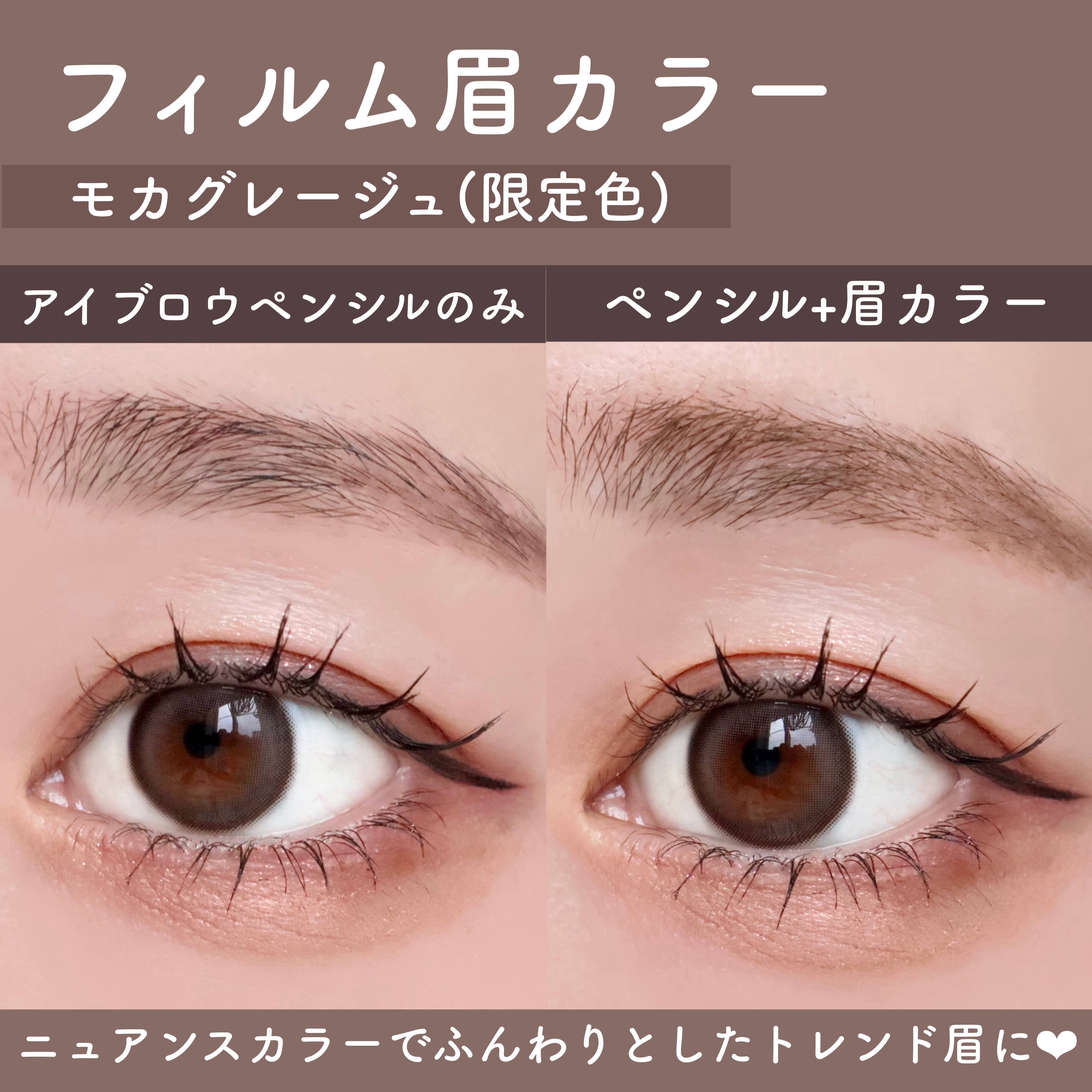 - \\25年3月定番新色モカグレージュ発売// 「フィルム眉カラー」なら眉の印象を自然にやわらげ、ふんわり質感の垢抜け眉に! 1.塗りやすい極小ブラシ ・ 先端直径3mmで、地肌に液がつきにくく根元から色づける ・余分な液がつかない設計で、ティッシュオフ不要 2.眉専用フィルム液 ・眉毛1本1本にキレイに色付き、自眉の黒さをやわらげる ・タバになったり、パリッと固まったりせず、まるで自眉のような仕上がり ・皮脂・汗・こすれに強いのにお湯で簡単オフ (※2025年9月以降、商品パッケージをリニューアル。)