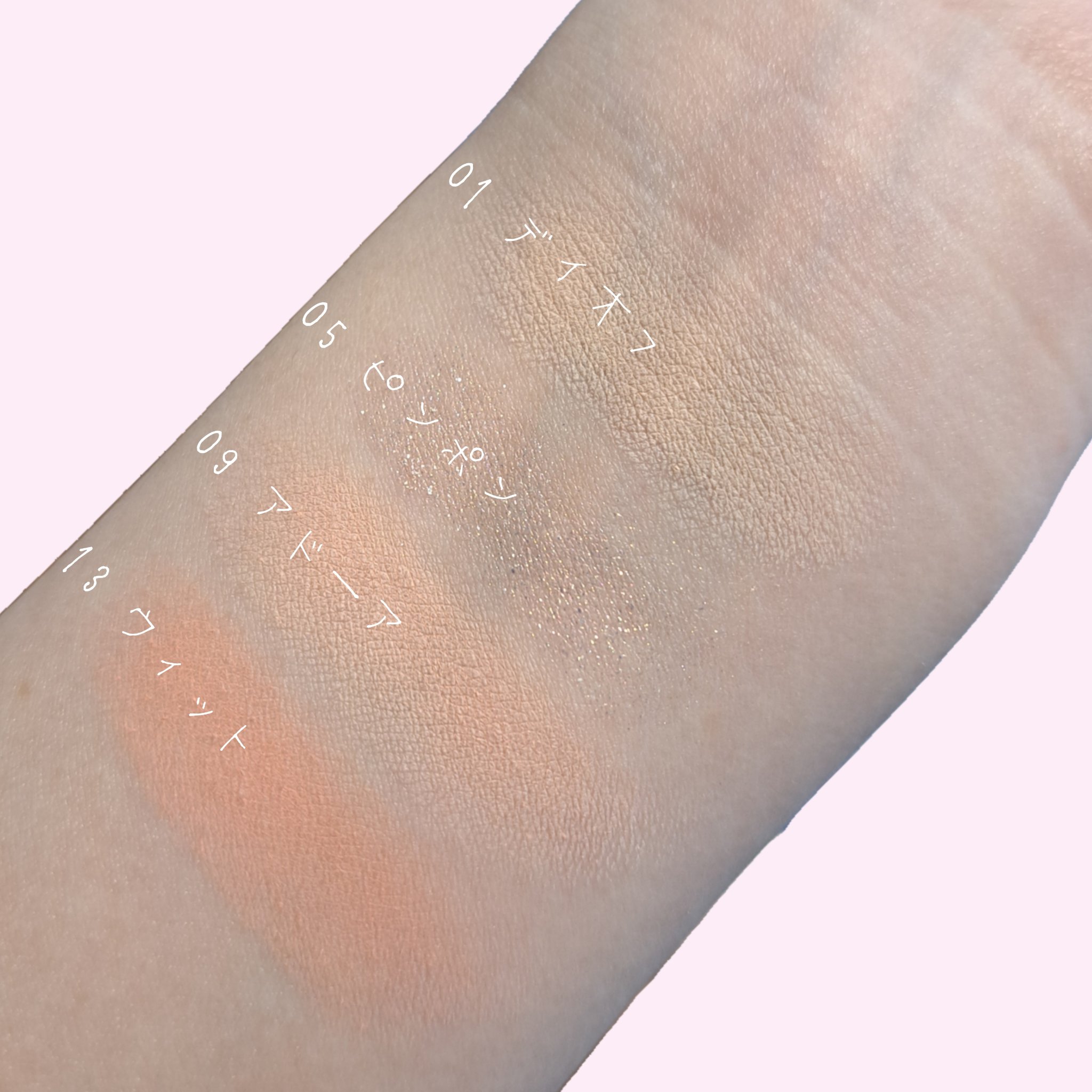 - <02 ライブリーブラーリング> タルク、マイカ、酸化チタン、ナイロン 12、シリカ、ステアロイルオキシステアリン酸オクチルドデシル、フェニルトリメチコン、ミリスチン酸Mg、ジメチコン、メチルプロパンジオール、ヘキサ(ヒドロキシステアリン酸/ステアリン酸/ロジン酸)ジペンタエリスリチル、リンゴ酸ジイソステアリル、酸化鉄、黄4、プロパンジオール、黄5、赤226、水添レシチン、水酸化Al、メチコン、カルミン、マルトデキストリン <03 サンセットブラーリング> ジメチコン、合成フルオロフロゴパイト、酸化チタン、メタクリル酸メチルクロスポリマー、マイカ、ホウケイ酸(Ca/チタン)、ジエチルヘキサン酸ネオペンチルグリコール、ラウリン酸ヘキシル、(ジメチコン/ビニルジメチコン)クロスポリマー、ナイロン 12、(セバシン酸/イソパルミチン酸)ジグリセリル、セスキイソステアリン酸ソルビタン、ミリスチン酸Mg、ヘキサ(ヒドロキシステアリン酸/ステアリン酸/ロジン酸)ジペンタエリスリチル、フェノキシエタノール、プロパンジオール、合成ワックス、酸化鉄、シリカ、トリエトキシカプリリルシラン、酸化スズ、カルミン、トコフェロール <05 ミューテッドコーラルブラーリング> タルク、マイカ、酸化鉄、シリカ、ナイロン 12、グンジョウ、ステアロイルオキシステアリン酸オクチルドデシル、フェニルトリメチコン、ミリスチン酸Mg、窒化ホウ素、ステアリン酸Mg、メチルプロパンジオール、ジメチコン、プロパンジオール、トリエトキシカプリリルシラン、ラウロイルリシン、水添レシチン、カルミン、マルトデキストリン <07 ソーダコーラルブラーリング> マイカ、オクテニルコハク酸デンプンAl、酸化チタン、ステアロイルオキシステアリン酸オクチルドデシル、フェニルトリメチコン、ミリスチン酸Mg、酸化鉄、マンガンバイオレット、窒化ホウ素、ステアリン酸Mg、メチルプロパンジオール、シリカ、ジメチコン、プロパンジオール、ステアリン酸ジメチコノール、トリエトキシカプリリルシラン、グンジョウ、ヒドロキシプロピルビスパルミタミドMEA、マカデミア種子油、サラソウジュ種子脂、水酸化Al、メチコン、カオリン、赤226 <14 キャラメルブラーリング> 1.ホウケイ酸(Ca/チタン)、タルク、マイカ、酸化チタン、ジエチルヘキサン酸ネオペンチルグリコール、フェニルトリメチコン、シリカ、ヘキサ(ヒドロキシステアリン酸/ステアリン酸/ロジン酸)ジペンタエリスリチル、ミリスチン酸Mg、リンゴ酸ジイソステアリル、ネオペンタン酸イソステアリル、ステアロイルオキシステアリン酸オクチルドデシル、マカデミア種子油、メチルプロパンジオール、ポリブテン、ステアリン酸Mg、プロパンジオール、ジメチコン、ラウロイルリシン、トリエトキシカプリリルシラン、酸化スズ、酸化鉄、カルミン 2.ホワイトソルト:ホウケイ酸(Ca/チタン)、酸化チタン、ジフェニルシロキシフェニルトリメチコン、ホウケイ酸(Ca/Na)、ポリプロピレン、マイカ、オクチルドデカノール、リンゴ酸ジイソステアリル、ダイマージリノール酸水添ヒマシ油、ポリブチレンテレフタレート、ダイマージリノール酸(フィトステリル/イソステアリル/セチル/ステアリル/ベヘニル)、ホウケイ酸(Ca/Al)、アクリレーツコポリマー、(エチレン/VA)コポリマー、メチルプロパンジオール、プロパンジオール、シリカ、ジステアルジモニウムヘクトライト、ステアリン酸Mg、炭酸プロピレン、酸化スズ、酸化鉄 3.バタークリーム:タルク、マイカ、酸化チタン、シリカ、ステアロイルオキシステアリン酸オクチルドデシル、フェニルトリメチコン、マカデミア種子油、メチルプロパンジオール、オクチルドデカノール、ヘキサ(ヒドロキシステアリン酸/ステアリン酸/ロジン酸)ジペンタエリスリチル、リンゴ酸ジイソステアリル、ジメチコン、ミリスチン酸Mg、ステアリン酸Mg、プロパンジオール、ステアリン酸ジメチコノール、水添レシチン、トリエトキシカプリリルシラン、水酸化Al、メチコン、酸化鉄 4.イエロービーン:タルク、マイカ、オクテニルコハク酸デンプンAl、シリカ、酸化チタン、トリ(カプリル酸/カプリン酸)グリセリル、トリエチルヘキサノイン、酸化鉄、ミリスチン酸Mg、マカデミア種子油、メチルプロパンジオール、ジメチコン、トリエトキシカプリリルシラン、プロパンジオール、(ビニルジメチコン/メチコンシルセスキオキサン)クロスポリマー、ヘキサ(ヒドロキシステアリン酸/ステアリン酸/ロジン酸)ジペンタエリスリチル、ステアリン酸Mg、水酸化Al、メチコン、グンジョウ、黄4 5.ベージュ:タルク、マイカ、酸化チタン、ステアロイルオキシステアリン酸オクチルドデシル、フェニルトリメチコン、シリカ、マカデミア種子油、サラソウジュ種子脂、ミリスチン酸Mg、メチルプロパンジオール、トリエトキシカプリリルシラン、ジメチコン、ステアリン酸Mg、プロパンジオール、水添レシチン、ラウロイルリシン、ステアリ