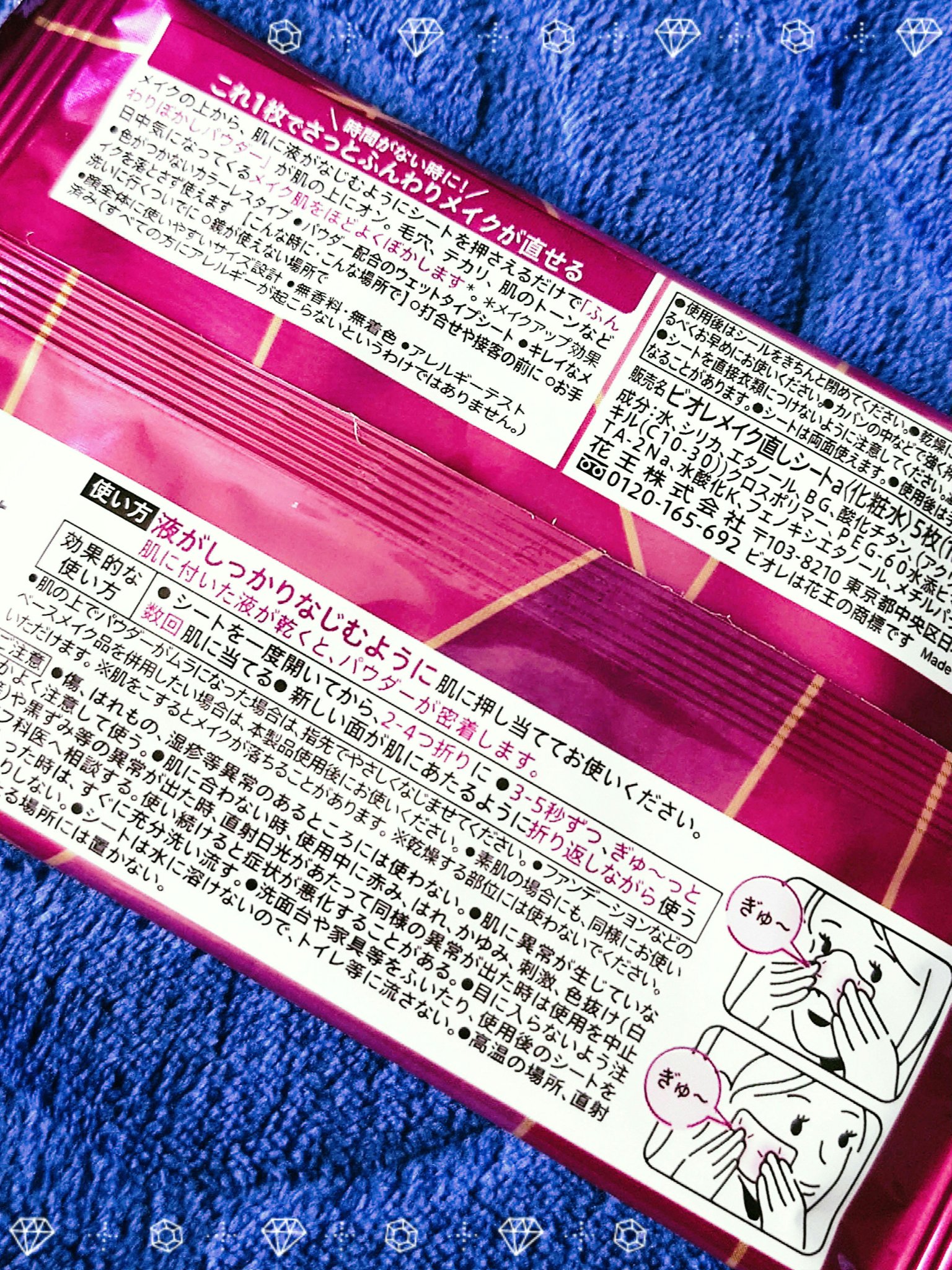 - <ビオレ メイク直しシート> 水、シリカ、エタノール、BG、酸化チタン、(アクリレーツ/アクリル酸アルキル(C10-30))クロスポリマー、PEG-60水添ヒマシ油、ラウレス-6、EDTA-2Na、水酸化K、フェノキシエタノール、メチルパラベン、エチルパラベン