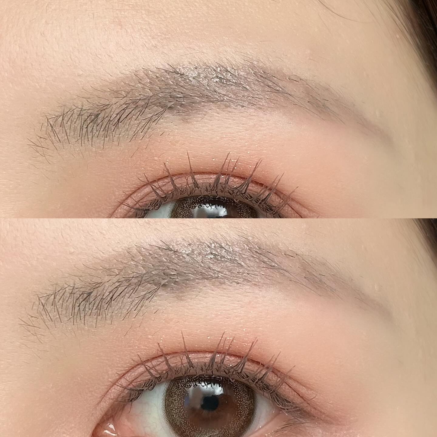 ほんの少し青みを感じるグレージュカラー 眉マスカラの色味も合わせて使うと眉毛の黒々しさが抑えられ抜け感のある仕上がりになる 屋外9時間、皮脂や少し汗をかいていても特に滲んだりしない、強く擦って段々薄まってくる程度なので擦れにも耐性がある PC問わず使いやすい色味 抜け感ある色味と仕上がり、筆当たりが優しく痛くない