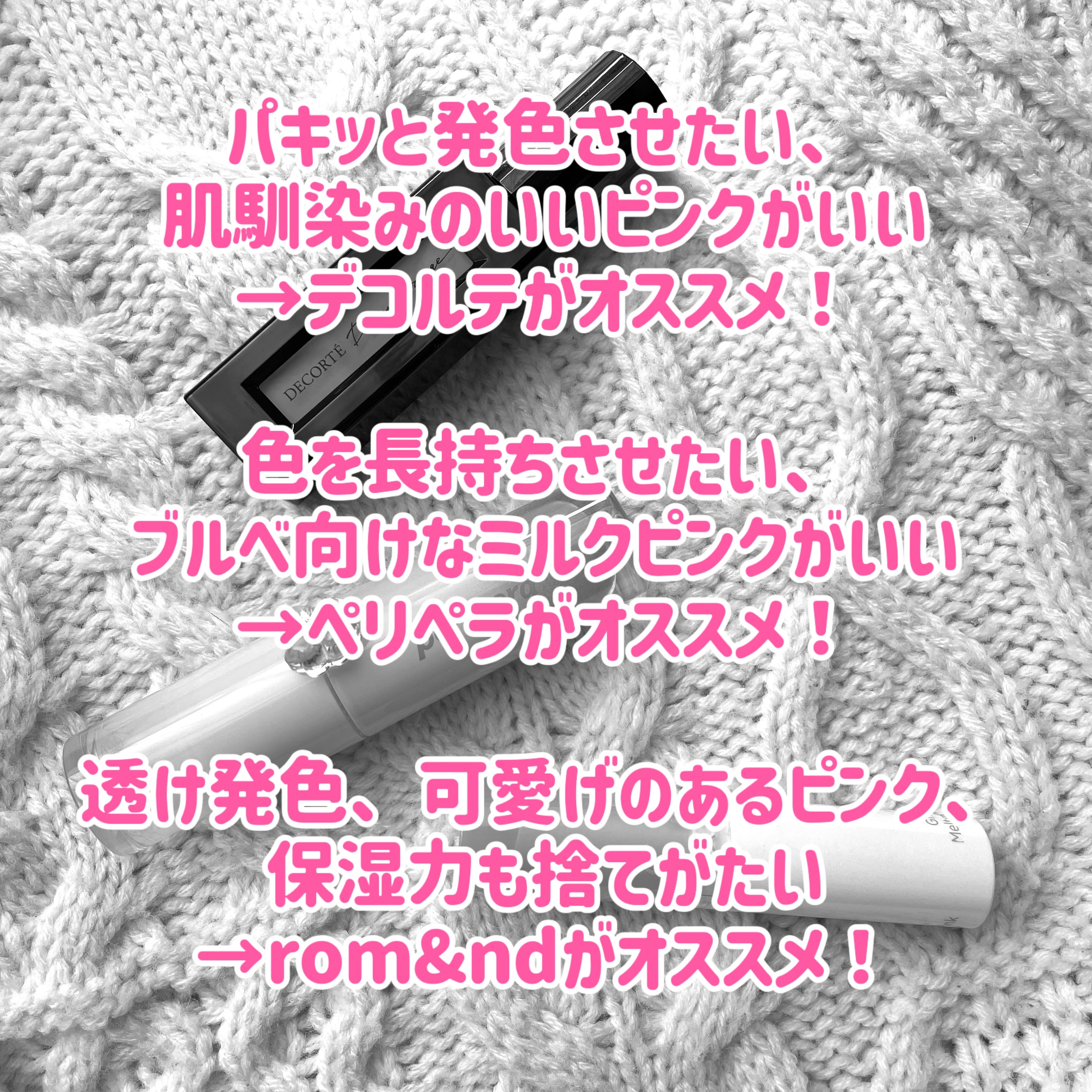 なんといっても付け心地の軽さが一番の魅力!(だと思ってる) 唇の中央に乗せて指でぽんぽん伸ばすと綺麗なグラデリップが作れてお気に入りだった!✨ ツヤはすぐなくなるけど、色持ちは結構良くて、2回くらい重ねて塗るといい感じ◎ ツヤ綺麗すぎるし、なによりもティント特有の濃くなる&赤くなる現象が起きにくい! 可愛いピンクが比較的長く続いてくれるから最高🥹 でもとにかく匂いが苦手、、、 仕上がりが本当に良すぎて匂いに負けじと使いまくってる🤣 これ初めて使ったときびっくりした! 色持ちが良すぎて🤣 がっつり塗るとかなり濃いめのピンクで、時間が経つとほぼ赤っぽいピンクになる。 ただ乾燥するのが難点。 ウォーターティントって名前なんだからよく考えたらわかりそうなものの、ペリペラの新作?!って飛び付いてメガ割で買ったよね🤣 特にインク ムード グロイ ティントは他のカラーも集めたいなあ🫶