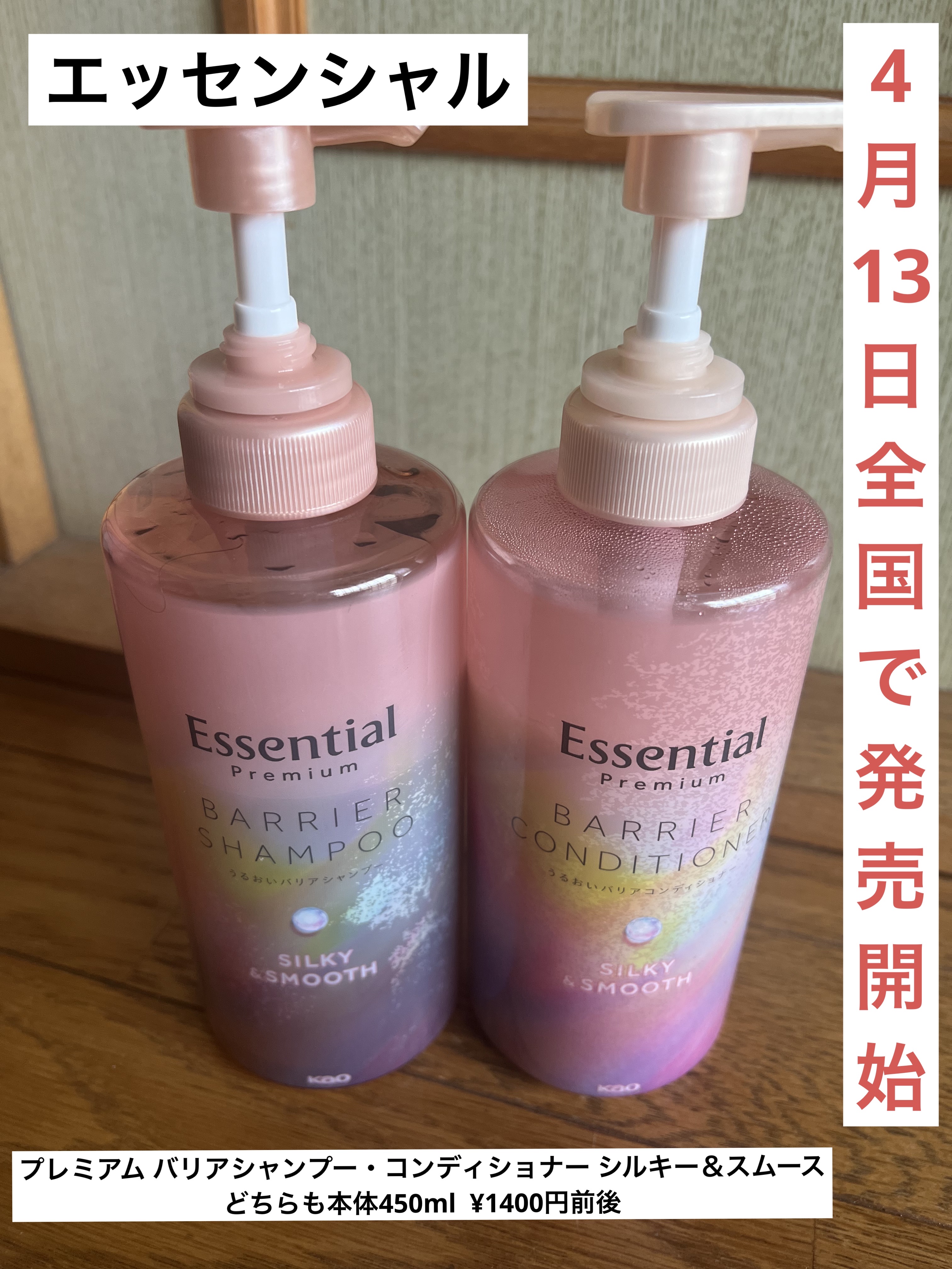 エッセンシャルプレミアムバリアシャンプー・コンディショナーシルキー&スムース〈説明〉・シャンプー・コンディショナー・450ml(両方とも)〈感想〉ホワイトピーチ&ムスクの香りは良い匂いで良かったです。シャンプーの洗浄力には私的には満足しました...
