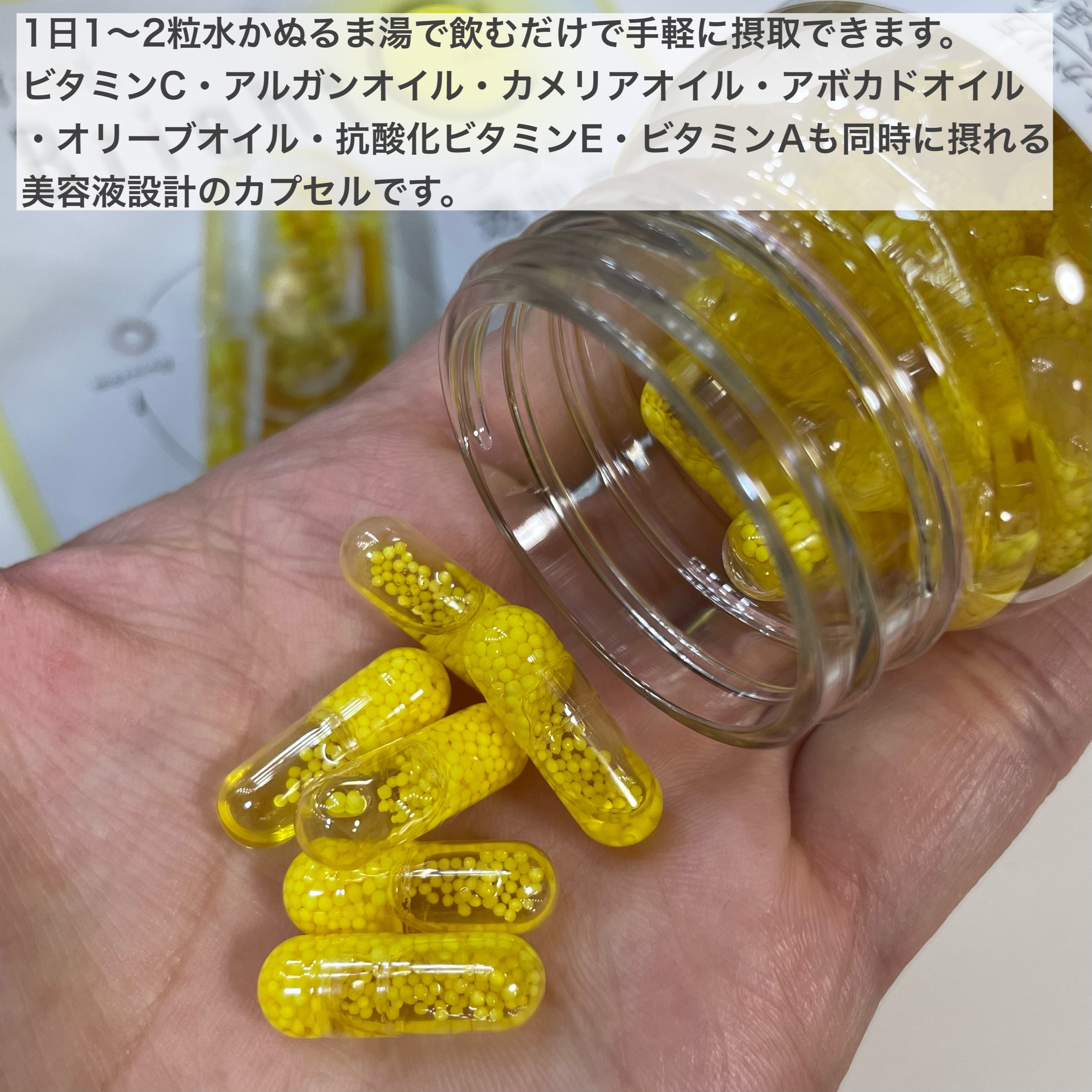 - 時間をかけてじっくり溶ける多重構造のビタミンCビーズをカプセルにぎゅっと詰め込みました。また、美容にうれしいアルガンオイル、カメリアオイル、アボカドオイル、オリーブオイルにビタミンE・ビタミンAも同時に摂れる美容液設計のカプセルです。 キレイ習慣をサポートする、栄養機能食品です。 【栄養機能食品(ビタミンC・ビタミンE)】 ビタミンCは、皮膚や粘膜の健康維持を助けるとともに、抗酸化作用を持つ栄養素です。 ビタミンEは、抗酸化作用により、体内の脂質を酸化から守り、細胞の健康維持を助ける栄養素です。 ●本品は、多量摂取により疾病が治癒したり、より健康が増進するものではありません。 ●1日の摂取目安量を守ってください。 ●本品は、特定保健用食品と異なり、消費者庁長官による個別審査を受けたものではありません。 ●食生活は、主食、主菜、副菜を基本に、食事のバランスを。
