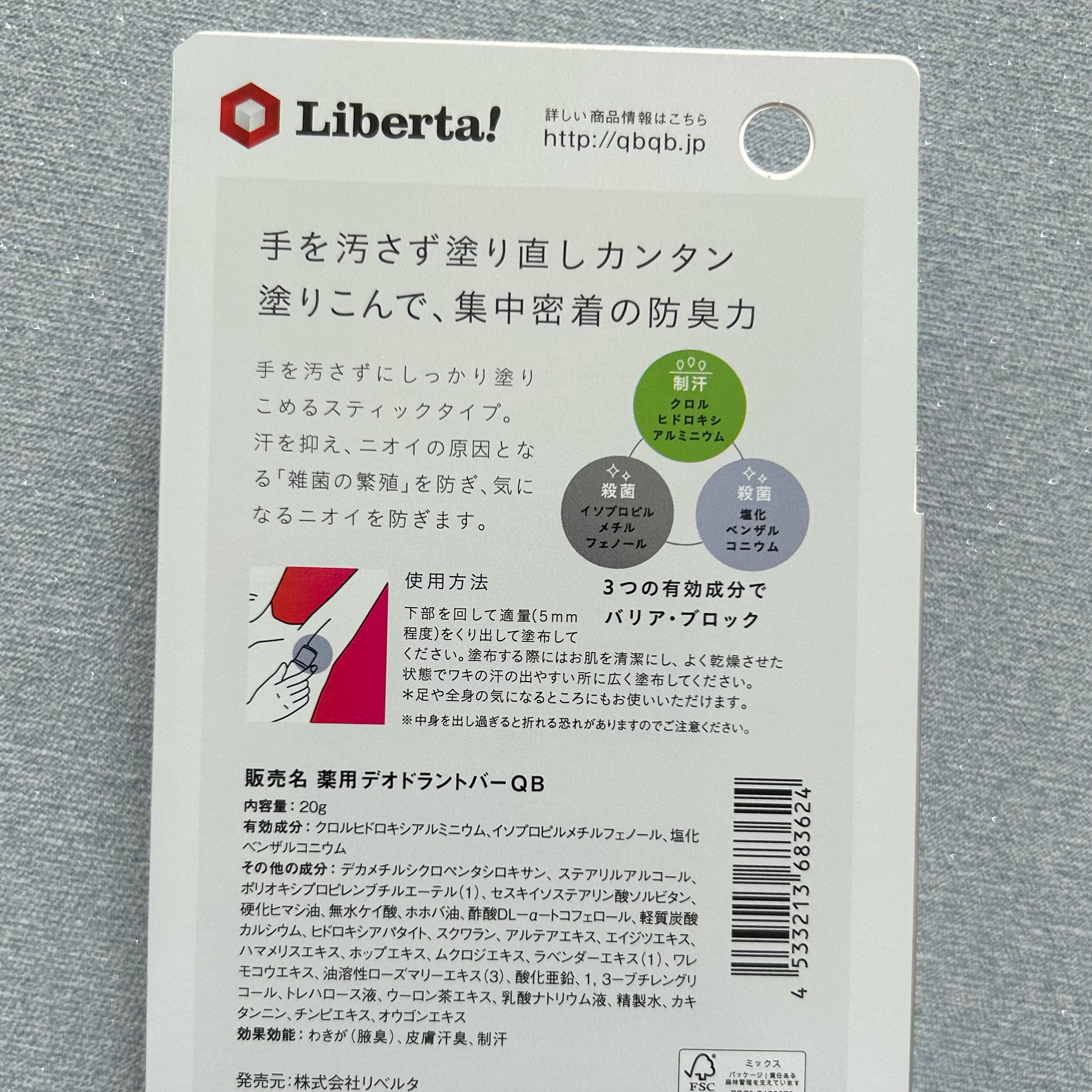 - 【医薬部外品】 目指したのは酷暑40℃対応デオドラント 20年こだわり続けた デオドラントの集大成* ニオイの悩み、裏切らない 手を汚さず塗り直しカンタン 手を汚さずにしっかり塗りこめるスティックタイプ 汗を抑え、ニオイの原因となる「雑菌の繁殖」を防ぎ、 気になるニオイを防ぎます 殺菌有効成分「イソプロピルメチルフェノール」「塩化ベンザルコニウム」を配合し、ニオイ菌を殺菌。 また制汗有効成分「クロルヒドロキシアルミニウム」で汗を抑え、過酷な気温状況下でも負けないデオドランドバーです。 *QB薬用デオドラントシリーズにおいて
