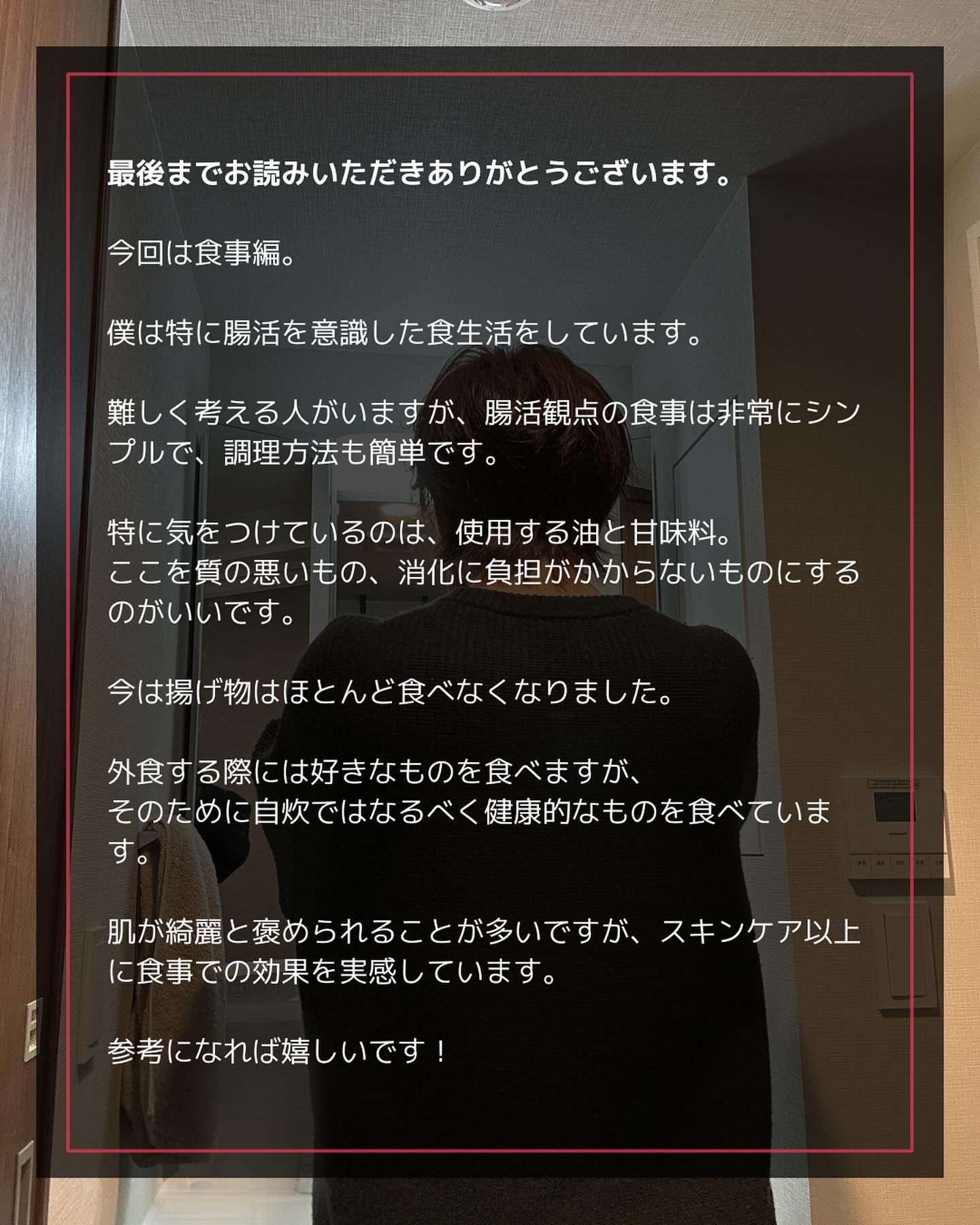 良質なシャンプーでヘアケア。 髪がパサついていたり、整っていないと老けた印象を与えてしまうと思うので、ヘアケアを徹底しています。 肌に必要な成分でスキンケア バズっているから使うのではなく、自分の肌に何が必要か理解してケアをすること。 食物酵素を積極的に摂る 食べ物から食物酵素を摂ることで、様々な良い効果が得られると言われてます。
